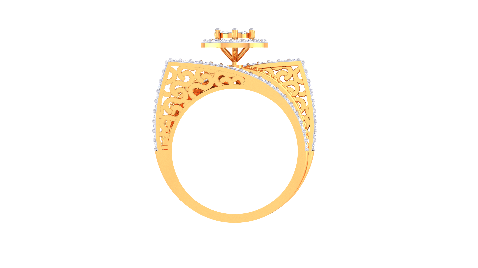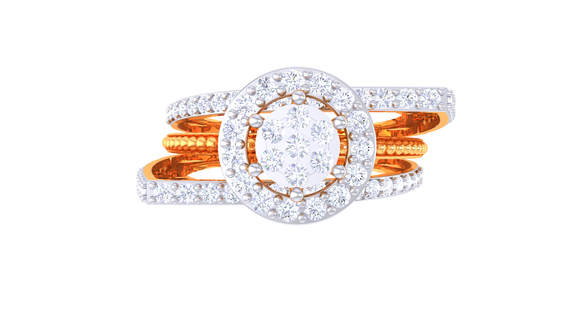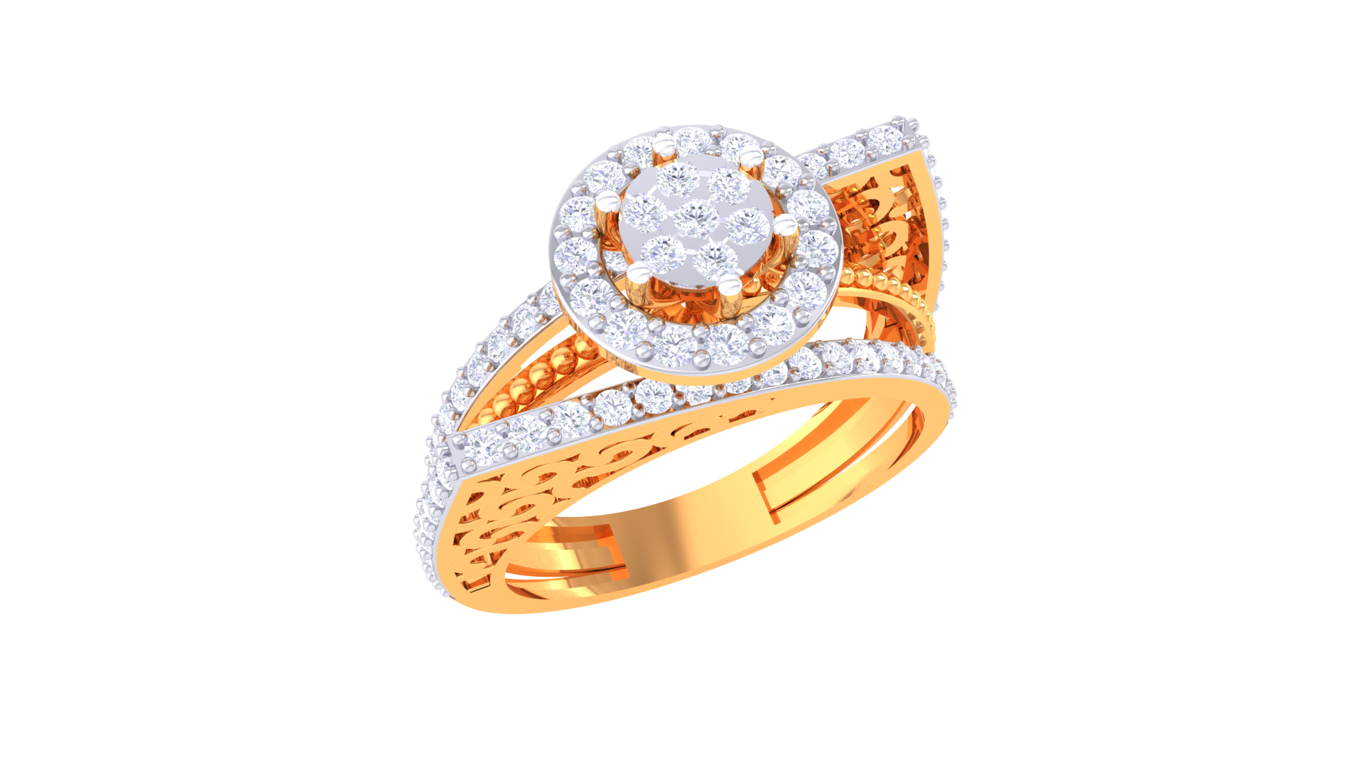 Lumière Aura Céleste – 2.25ct Diamond Gold Ring dazzles with a vibrant round cluster (2.25 carats) encircled by a luminous halo and split pavé bands.