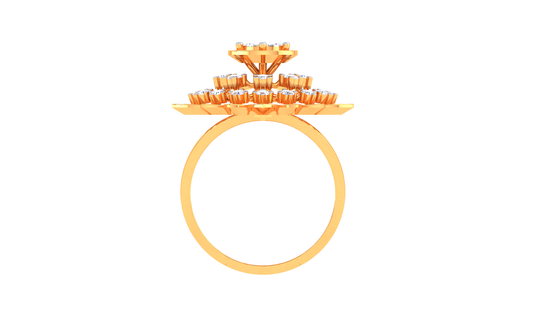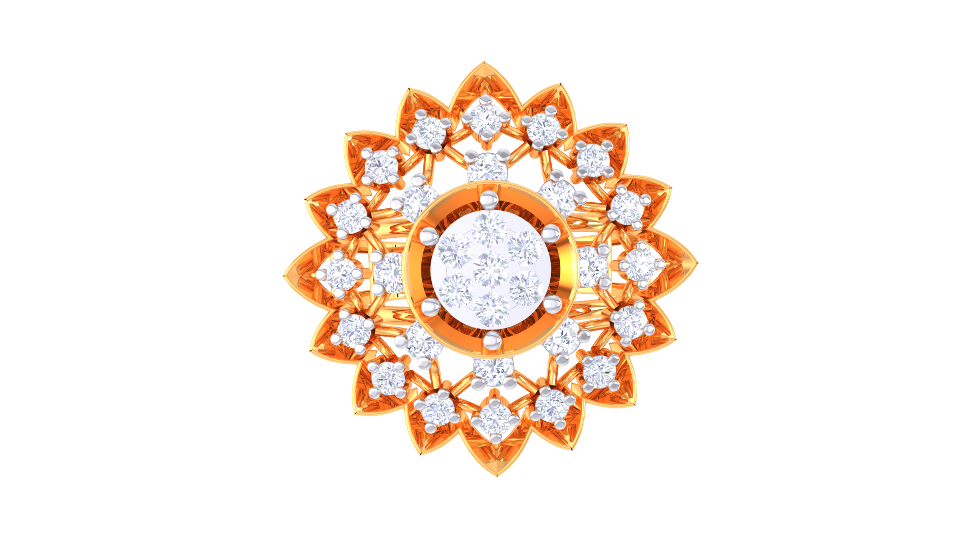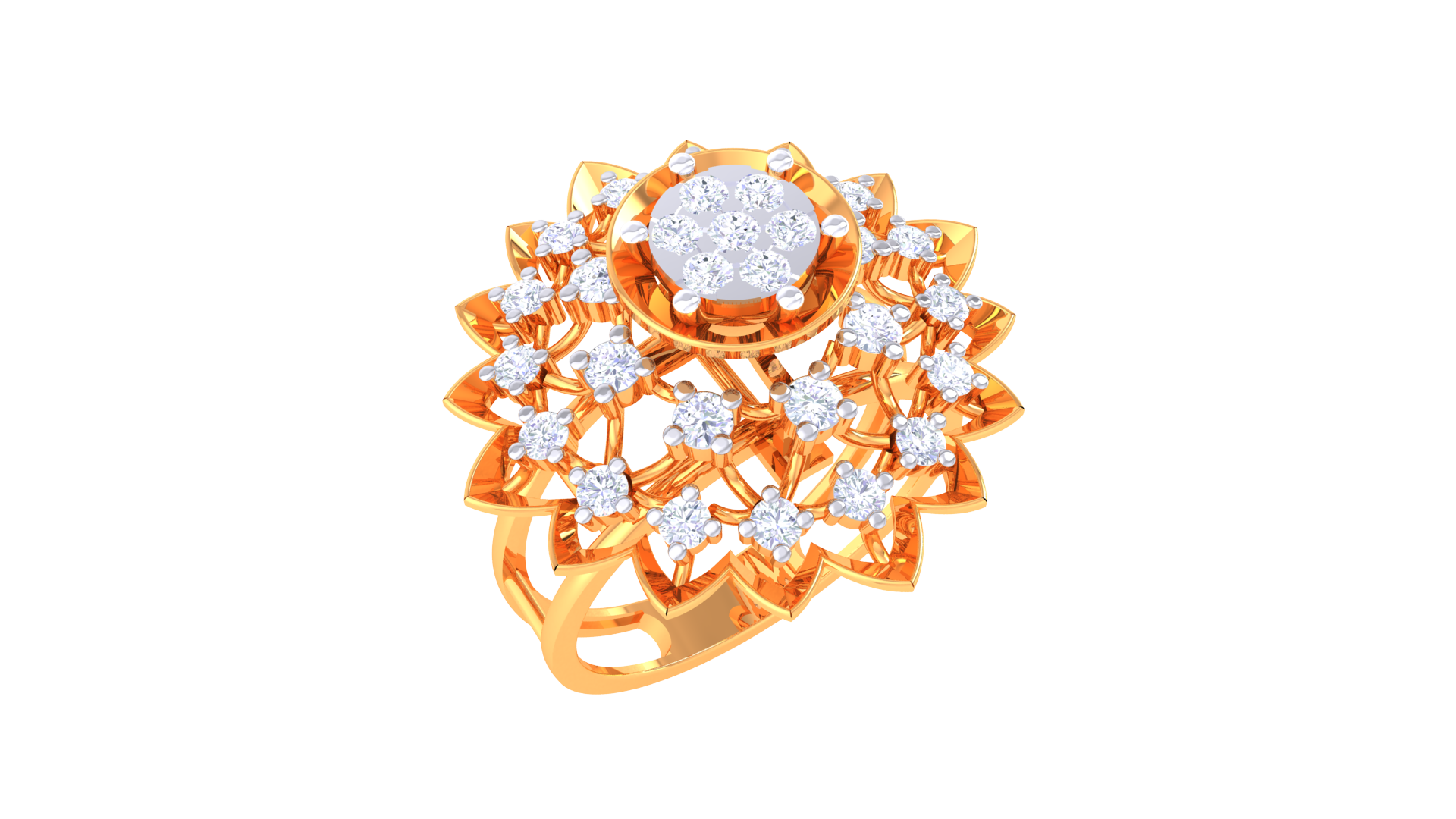 Éclat Couronne Florale – 0.44ct Diamond Gold Ring blooms with layered artistry, where a round diamond centerpiece glistens in a geometric, floral arrangement of sparkling accents. Rendered in 6.72 grams of 18kt gold, its total diamond weight is 0.44 carats, designed to capture attention and celebrate modern floral luxury.