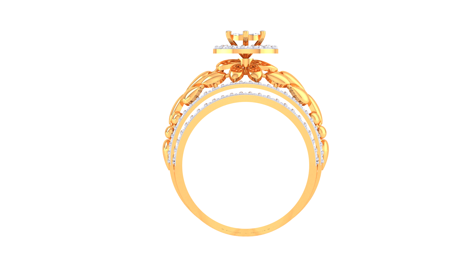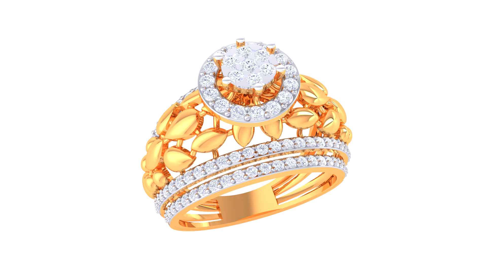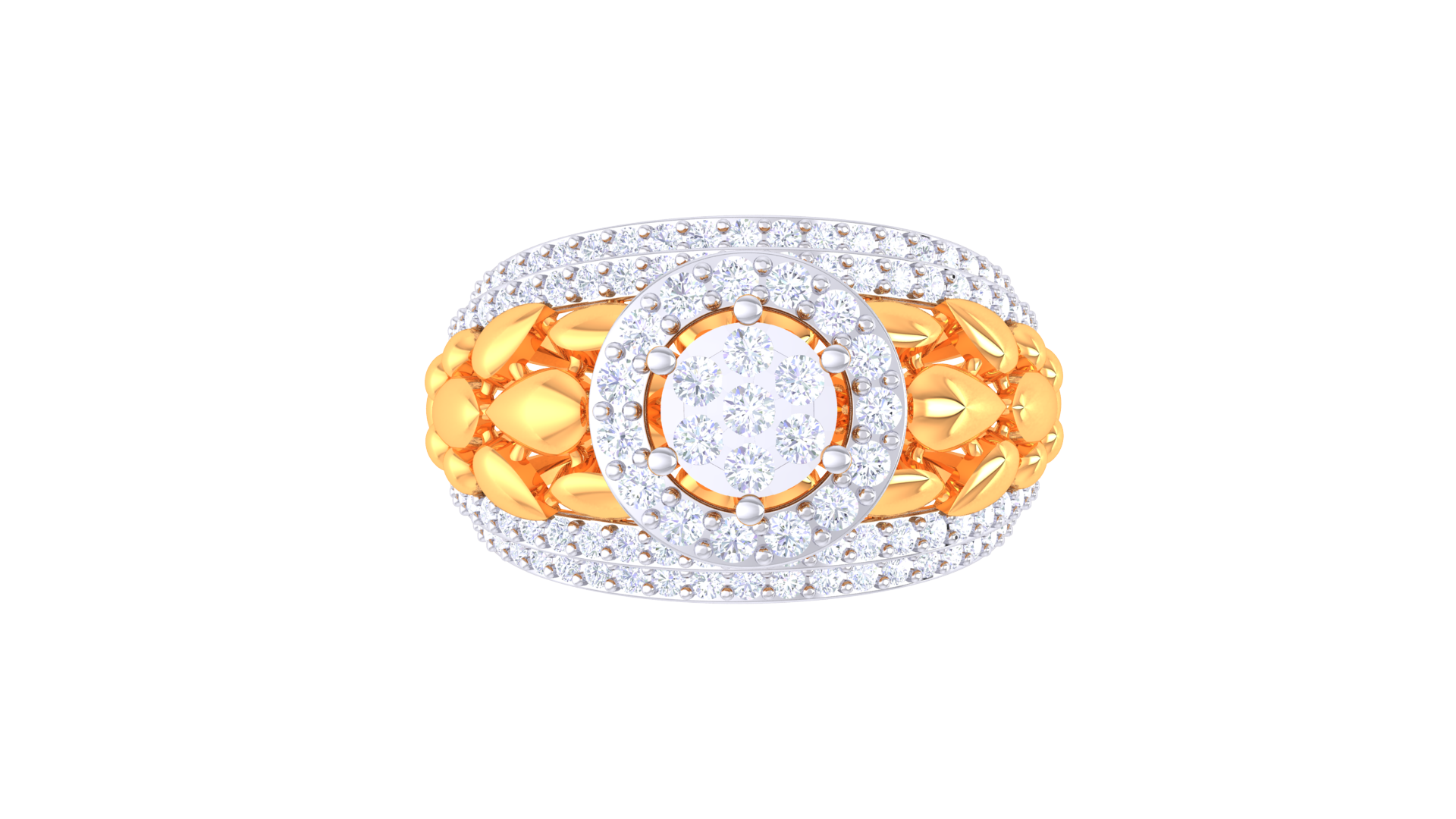 Éclat Motif Radiant – 0.63ct Diamond Gold Ring spotlights a luminous round diamond cluster framed by intricate geometric pavé and polished gold lattice. Cast in 6.6 grams of 18kt gold with 0.63 carats of brilliant round diamonds, this ring delivers modern artistry and a bold luxurious feel.