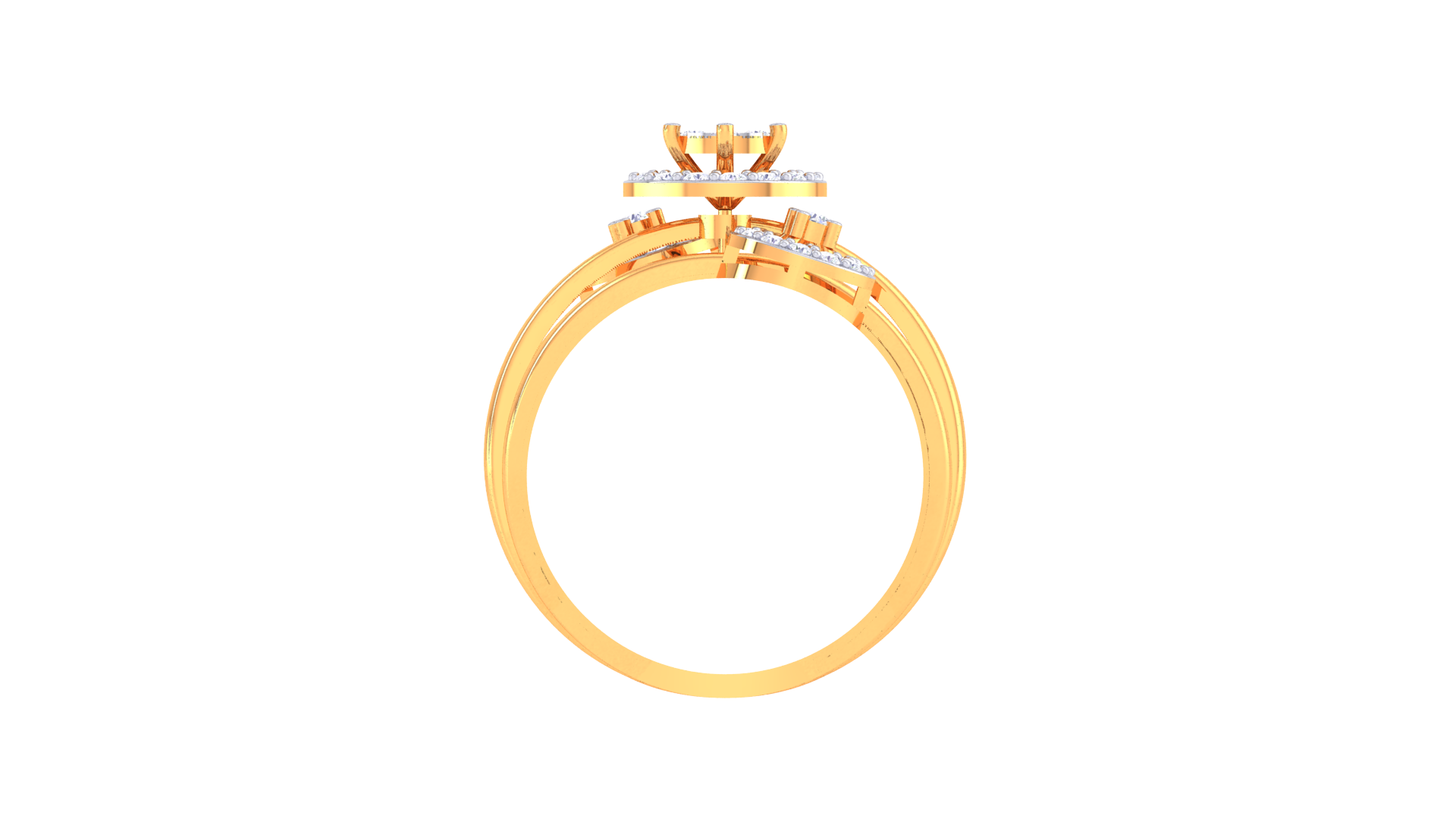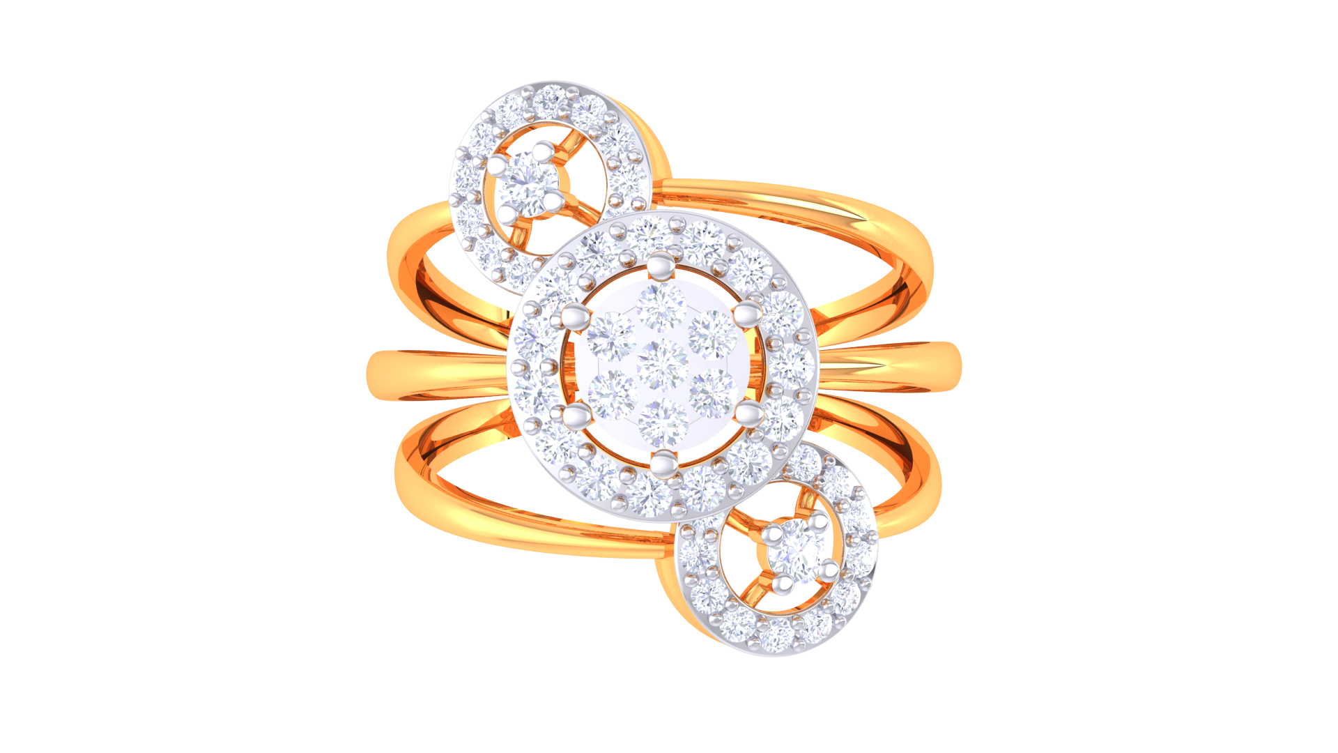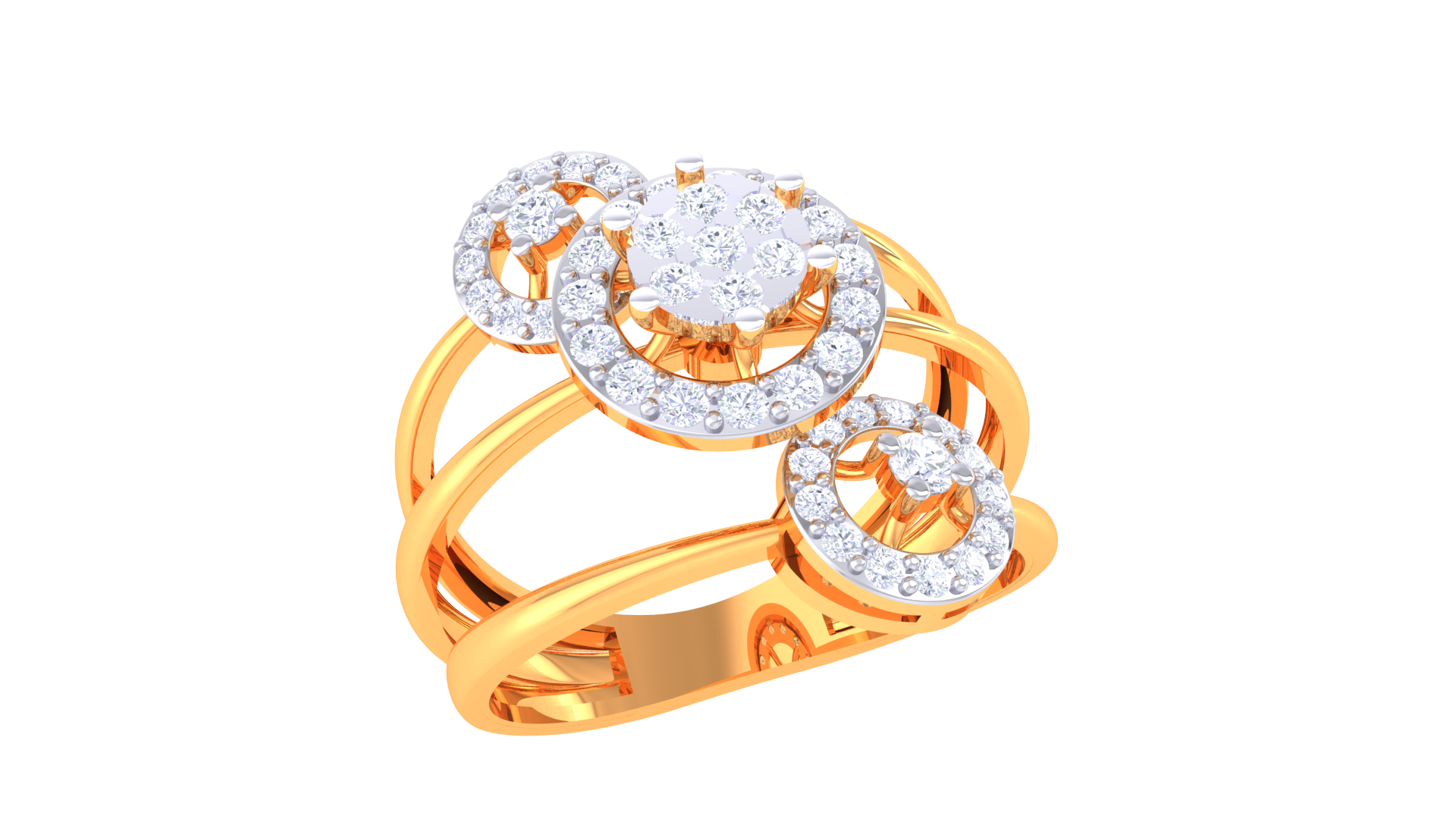 Trilune Orbitale Radiance – 0.44ct Diamond Gold Ring features three sparkling round diamond halos in an artful orbital design atop sleek 18kt gold bands. With a total diamond weight of 0.44 carats and 4.99 grams of gold, this piece illuminates celestial inspiration for modern luxury.