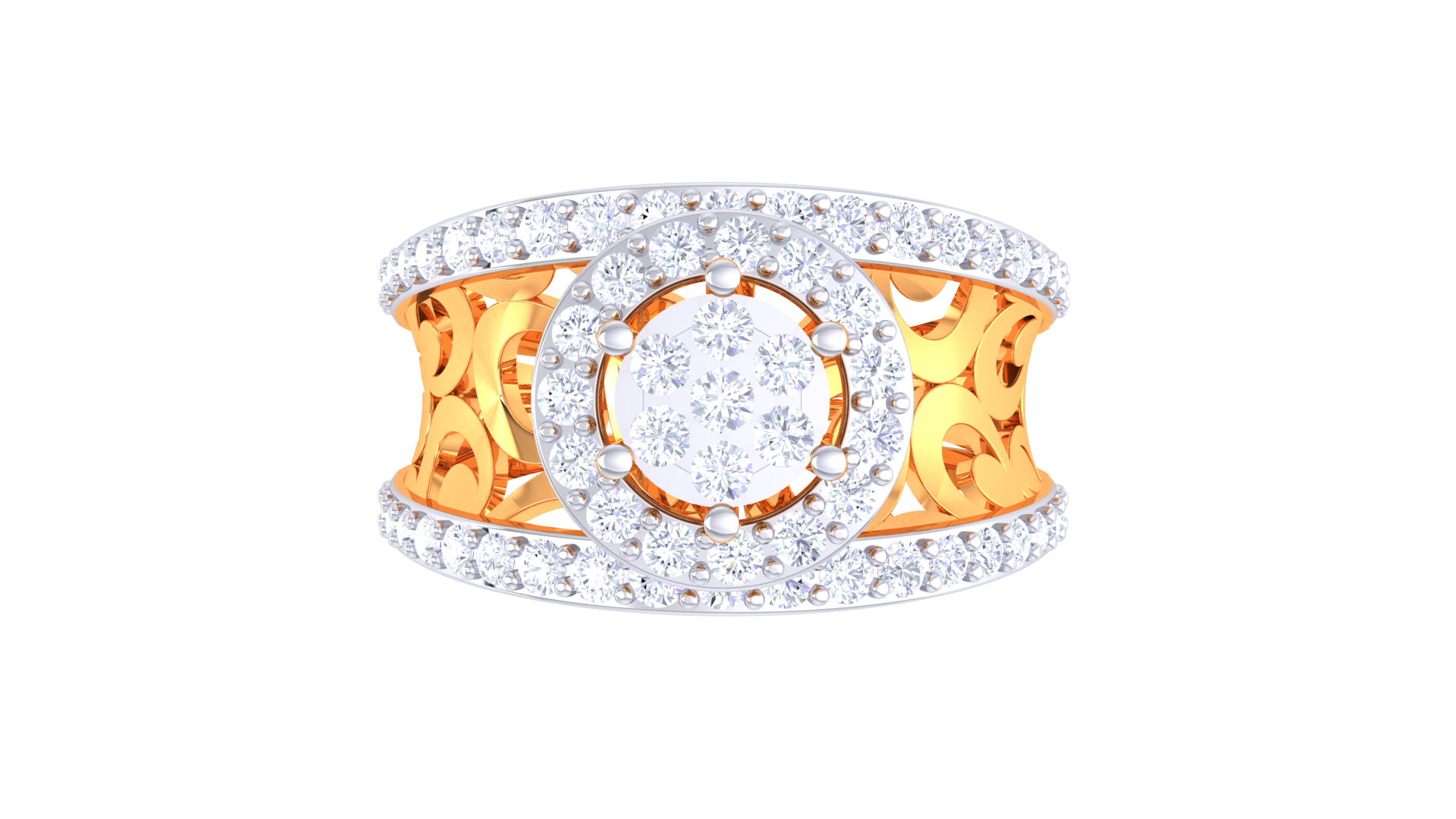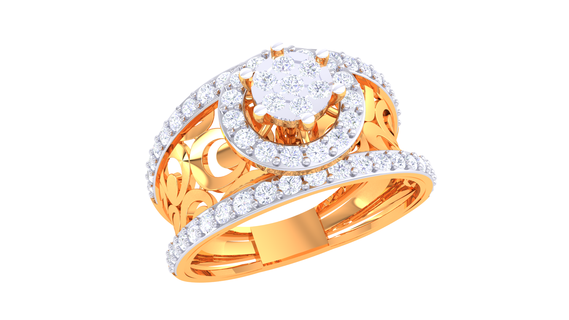 Éclat Filigrane Luminary – 0.67ct Diamond Gold Ring radiates modern glamour with a bold round diamond cluster, framed by ornate gold filigree and dual pavé rows for dramatic brilliance. Expertly crafted in 5.93 grams of 18kt gold and sparkling with 0.67 carats of round diamonds, this statement ring blends artistry and luxury in every detail.