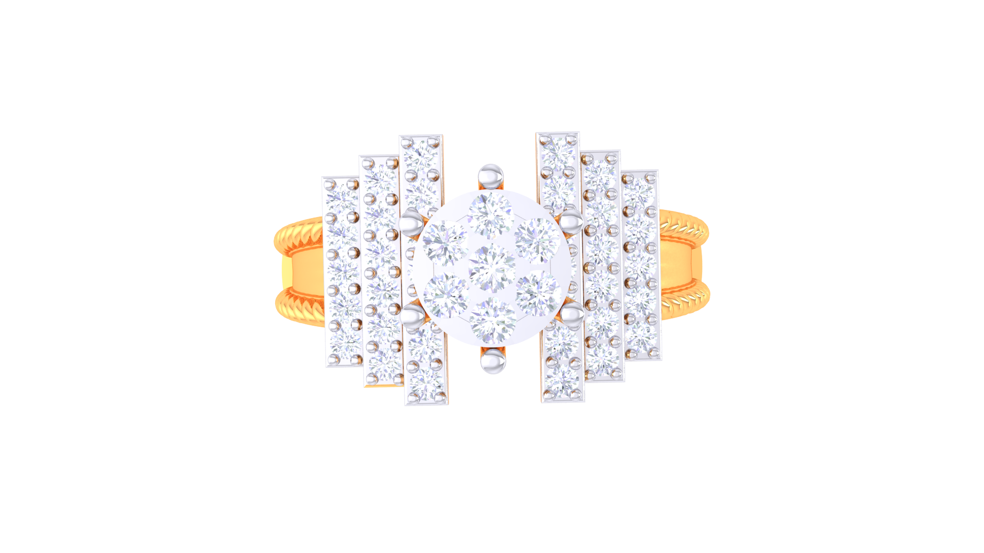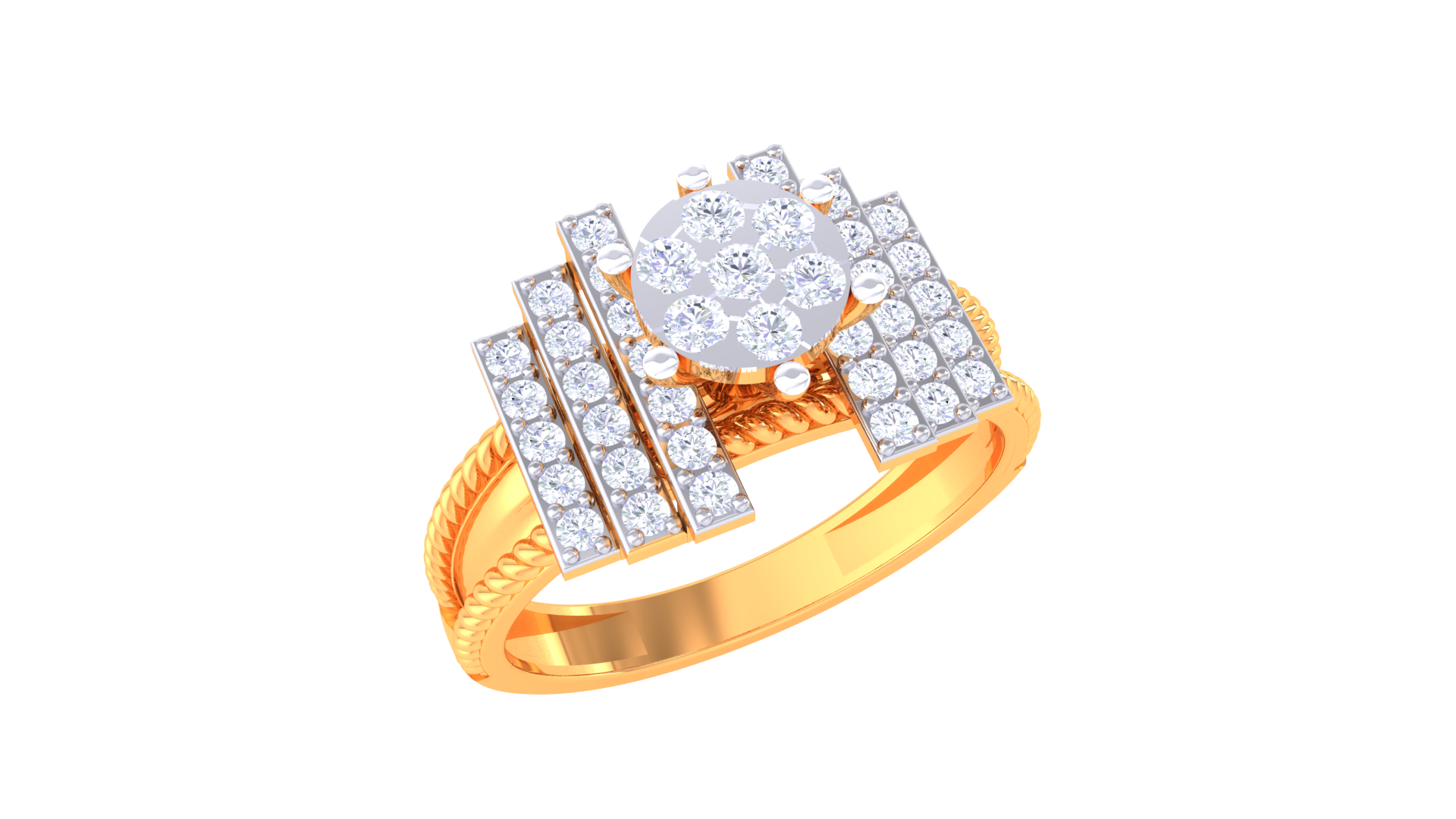 Lumière Avant Structure – 0.43ct Diamond Gold Ring stands out with a round diamond centerpiece flanked by dazzling geometric pavé accents. Handcrafted in 5.88 grams of rich 18kt gold and set with 0.43ct of brilliant round diamonds, this ring radiates modern artistry and bold luminosity, making every facet sparkle with contemporary elegance.