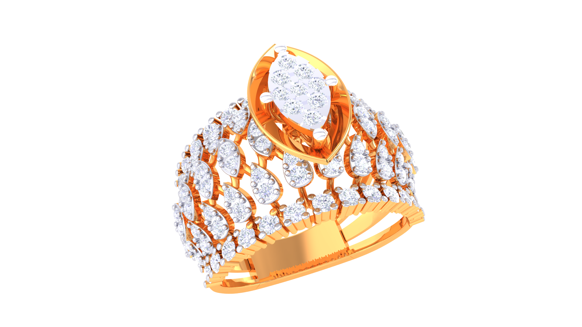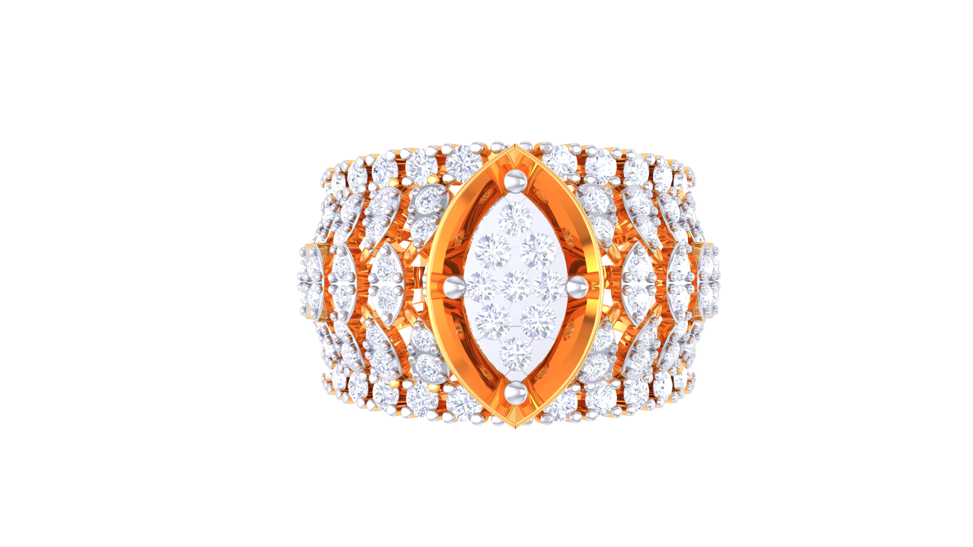 Éclat Visionnaire Marquise – 1.01ct Diamond Gold Ring features a striking 1.01ct marquise diamond framed by bold pavé clusters and modern gold artistry. Crafted with 7.56 grams of 18kt gold, this ring delivers dazzling statement brilliance with every glance.