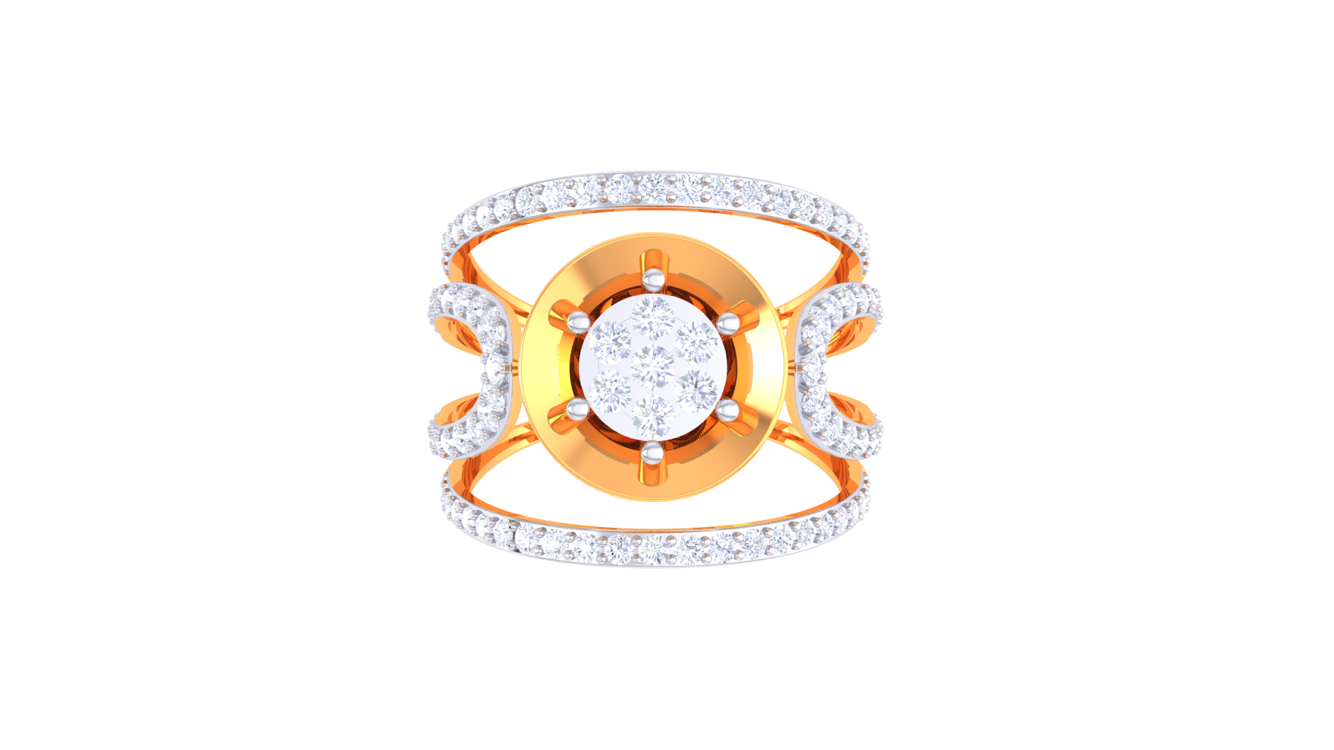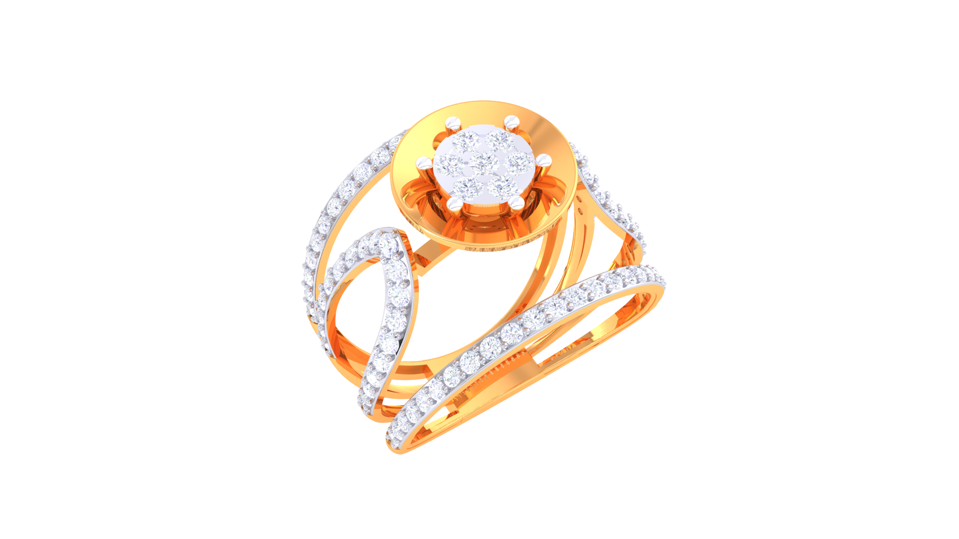 Éclat Orbiste Moderne – 0.78ct Diamond Gold Ring features a brilliant 0.78ct round diamond at the heart of an artistic gold design, framed by contoured pavé bands for bold visual impact. Crafted from 5.2 grams of 18kt gold, this sculptural ring commands attention with its contemporary curves and radiant symmetry.