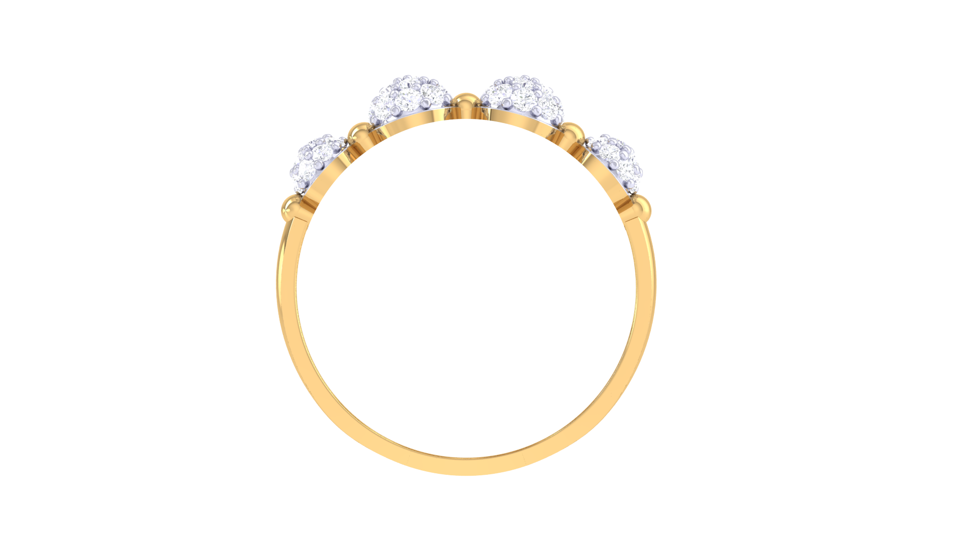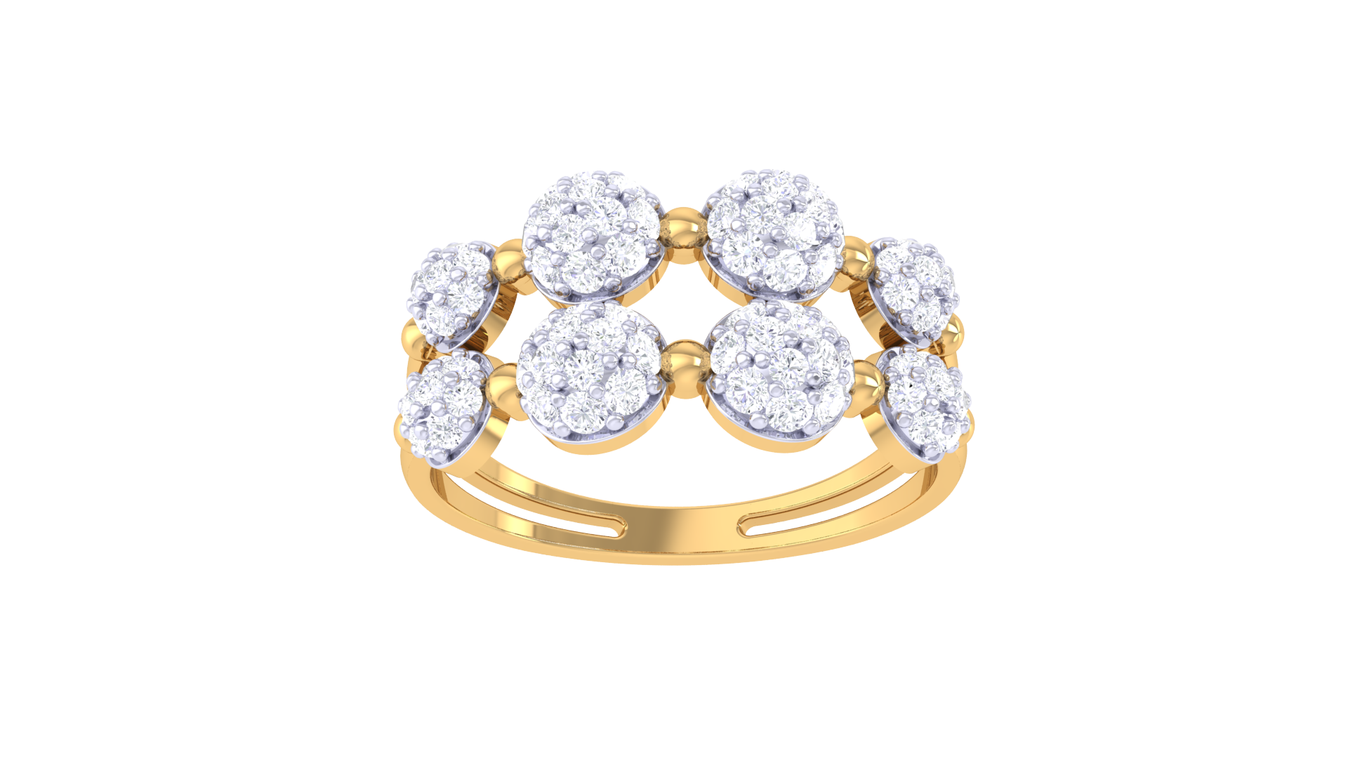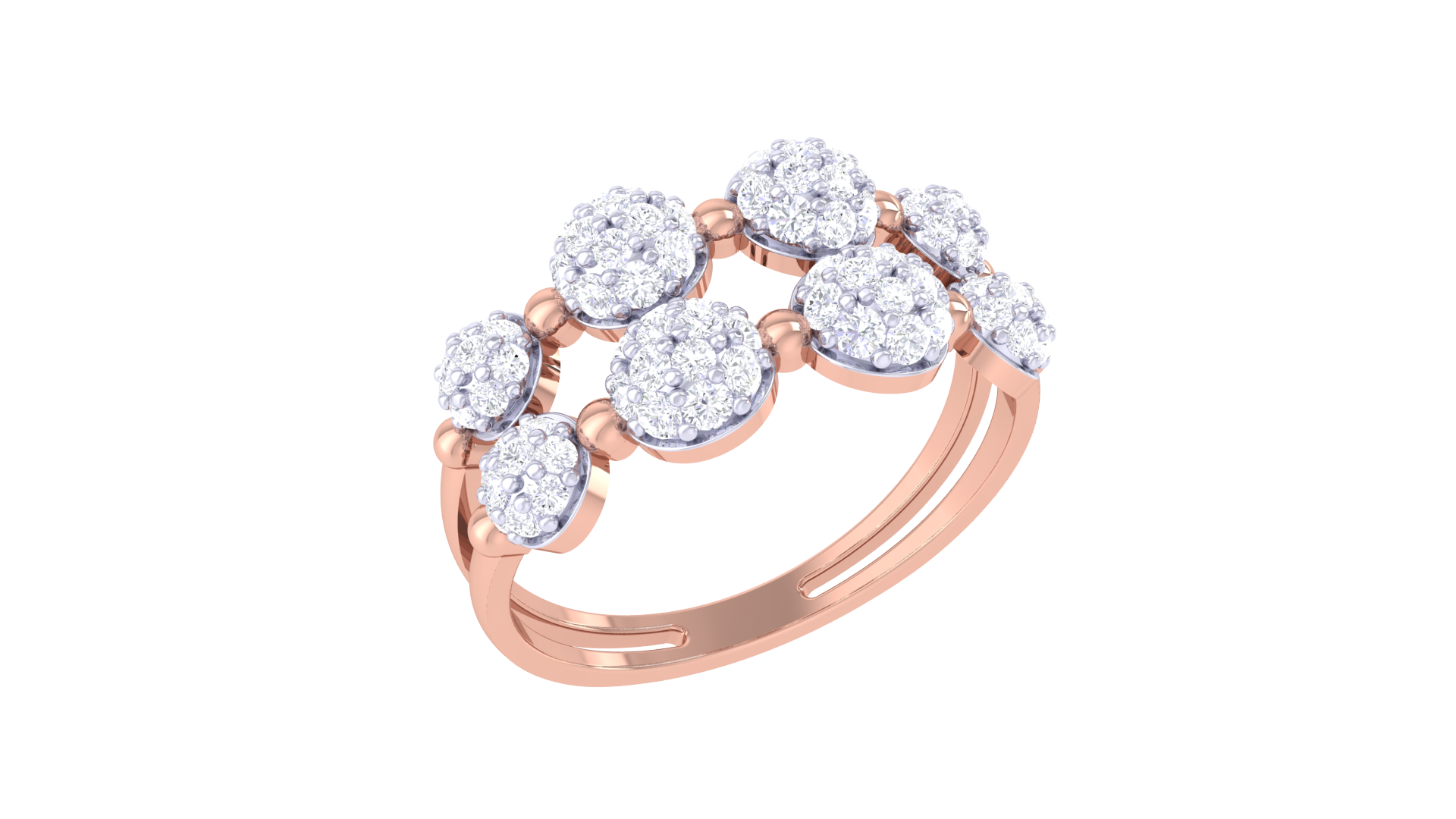 Each circular cluster sparkles with brilliance, creating a rhythmic pattern of light across the split shank band.