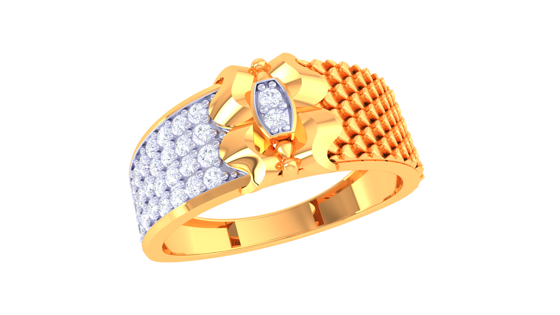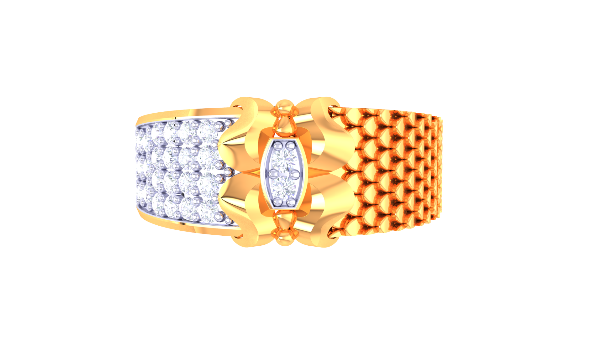 The Iconique Signature Band – 0.43ct Regal Pavé Diamond Ring, crafted in 18K gold weighing 4.40 grams, features a sculpted crown-inspired center with pavé diamonds and intricate gold mesh.