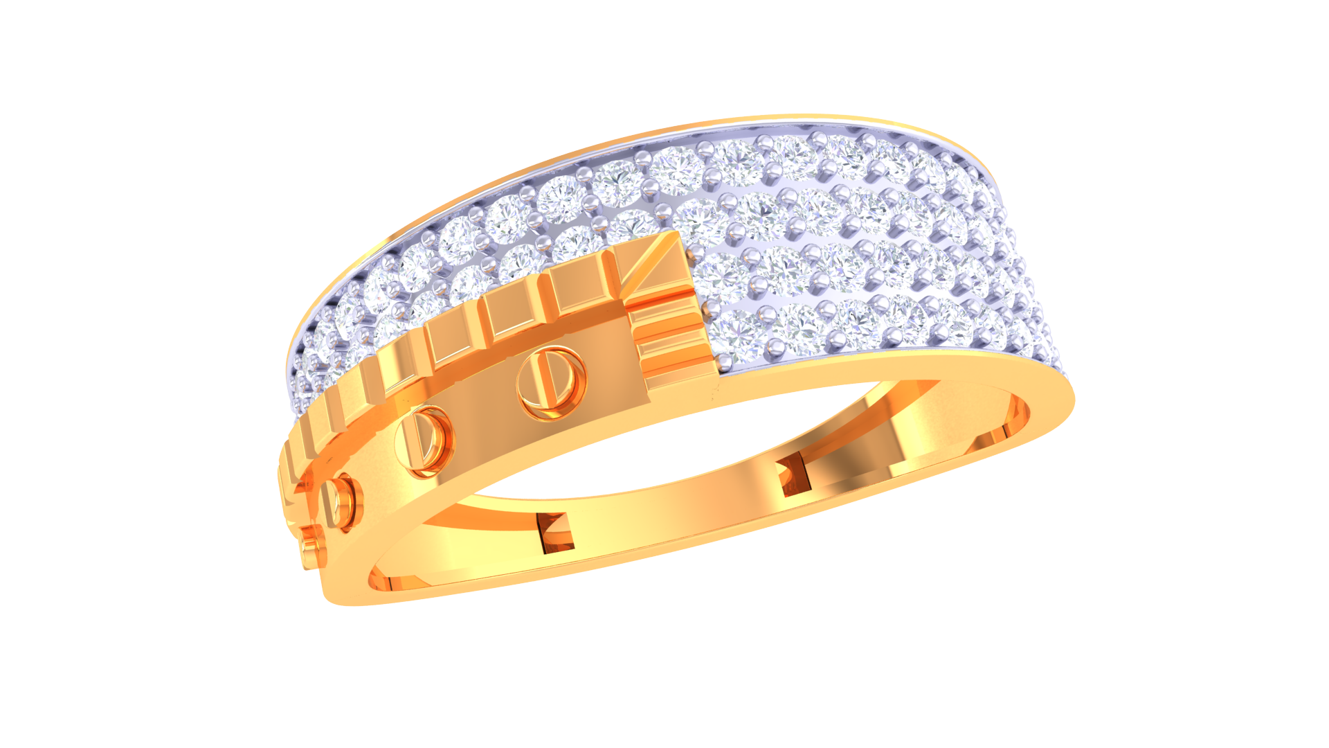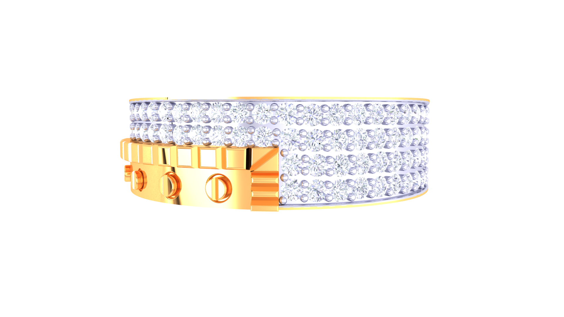 The Lumière Accent Urbain is a modern pavé showpiece crafted from 2.81 grams of 18kt gold, featuring 0.62ct of round diamonds that gleam in precise parallel rows.