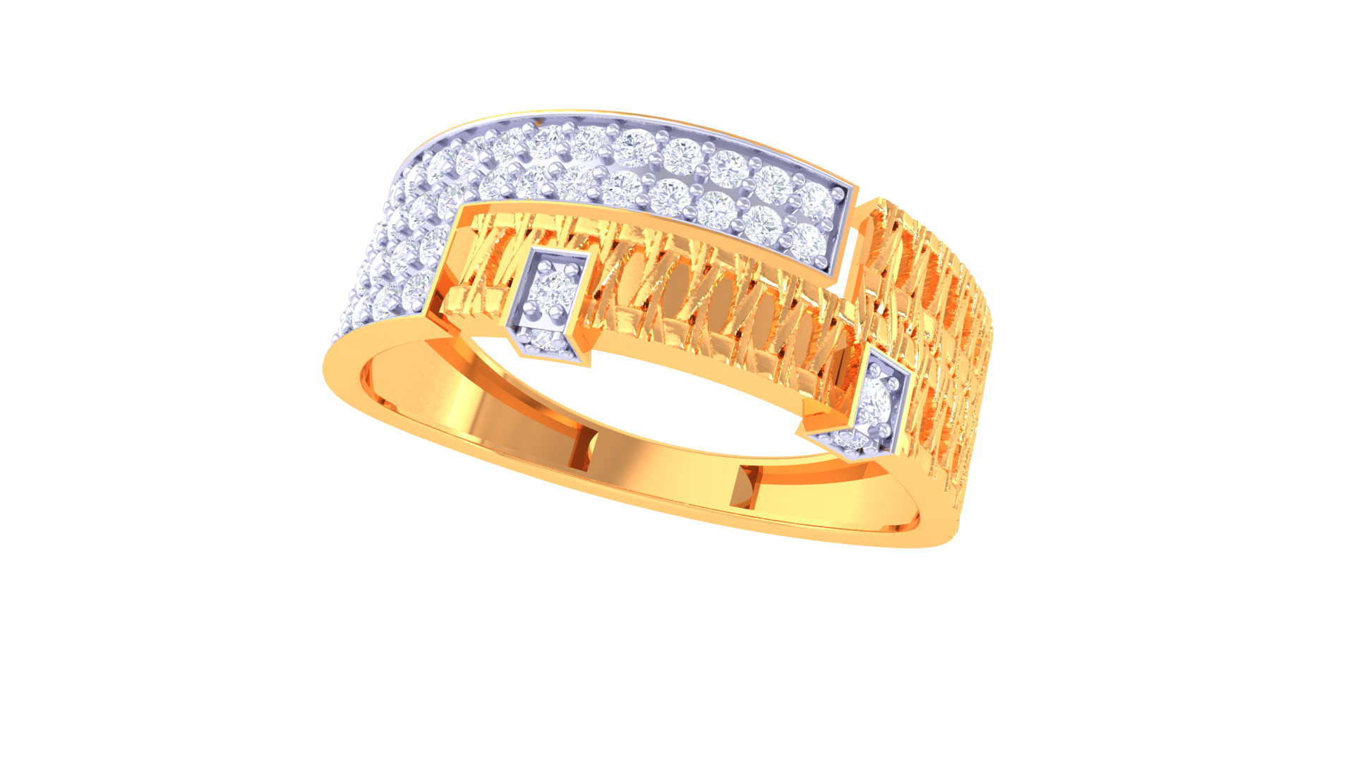 Its striking architectural motif and gleaming gold texture create an electrifying play of light across every angle, making this ring an effortless statement of city-inspired luxury.