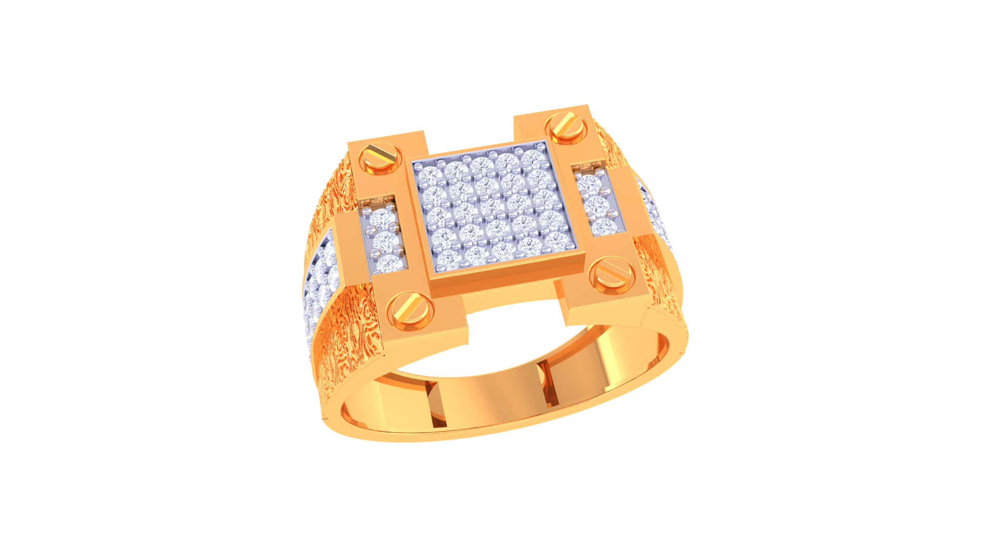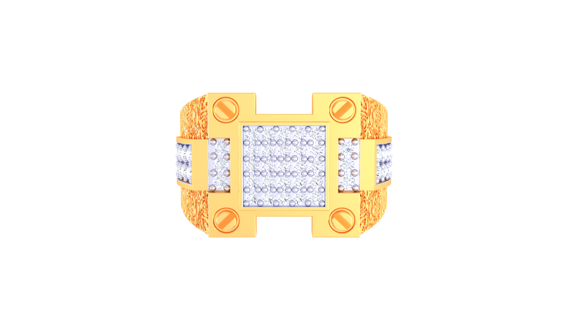 The Éclat Signature Motif – 0.72ct Diamond Gold Ring, crafted in 18K gold weighing 6.40 grams, features a modern pavé diamond panel framed by architectural motifs and screw-inspired accents.
