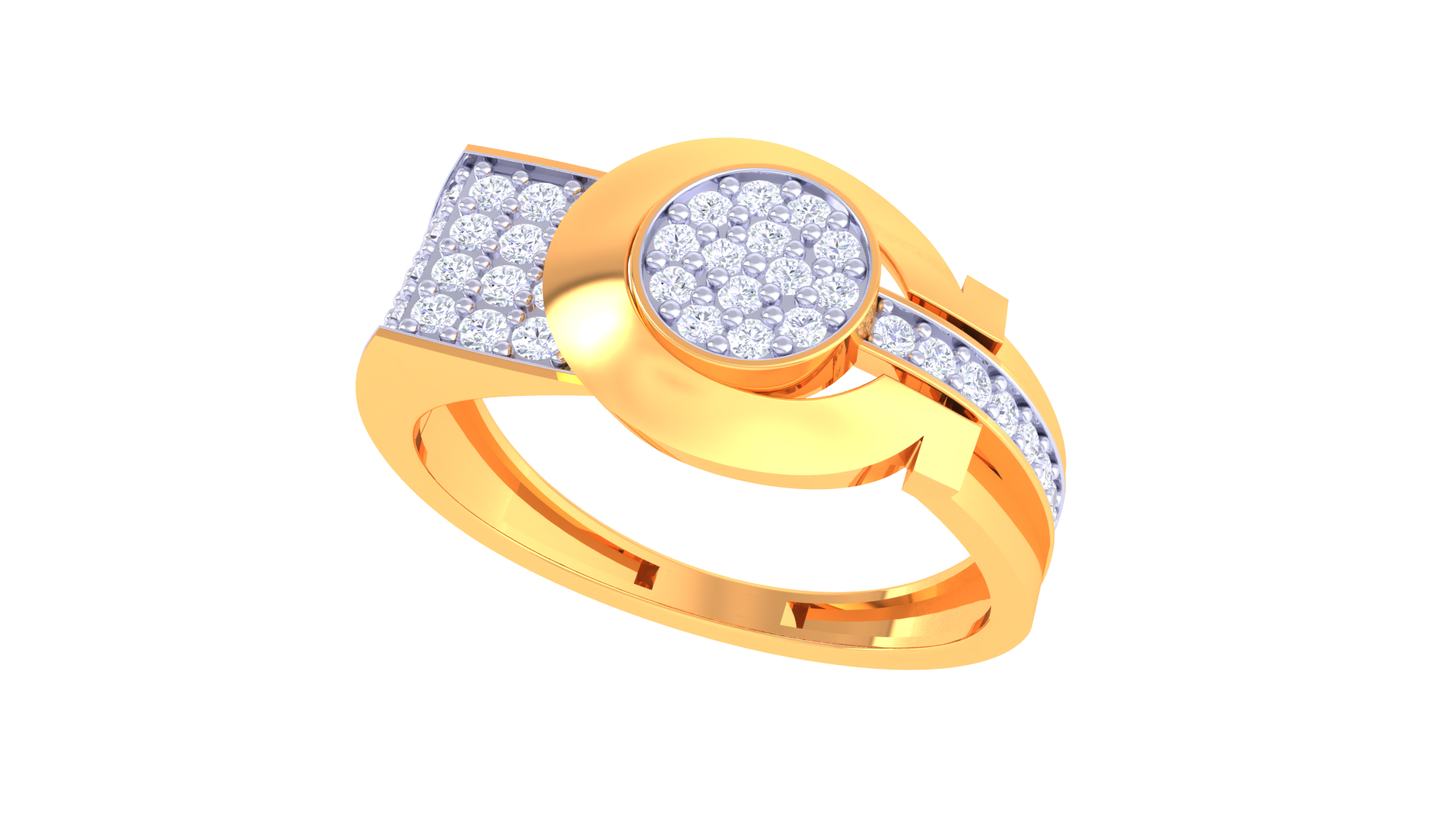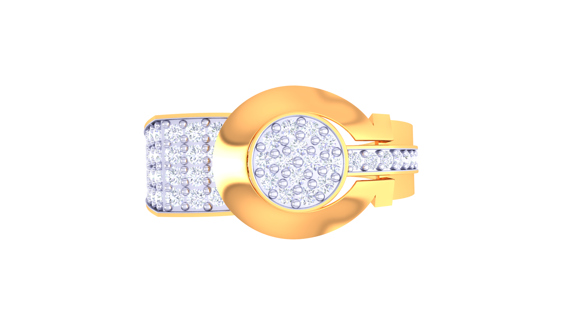 The Éclat Dimension Enclos – 0.57ct Diamond Gold Ring, crafted in 18K gold weighing 4.17 grams, features an enclosed pavé circle framed by sculptural gold arcs.