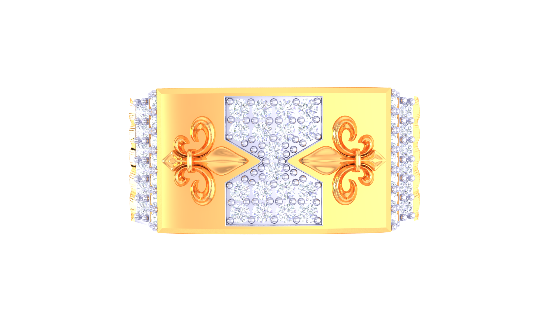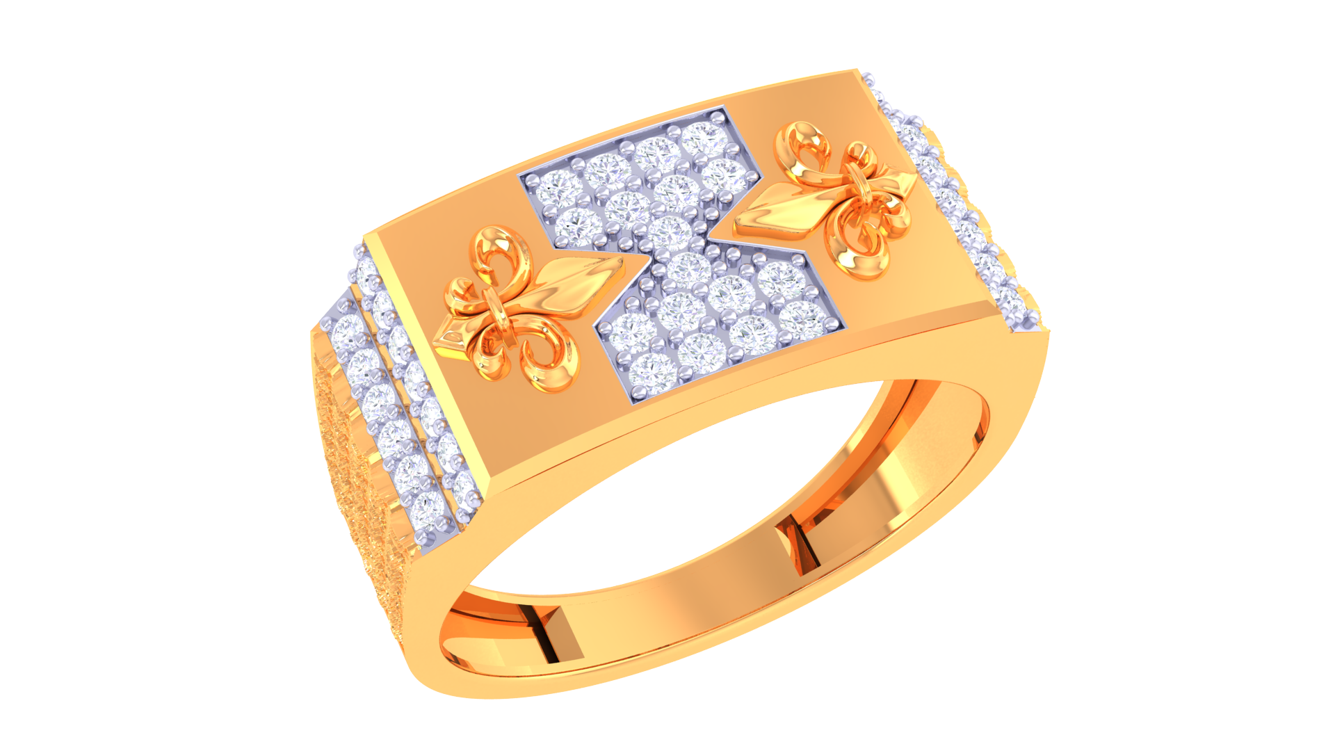 The Artisan Fleuron Héritage ring features 4.76 grams of 18kt gold, accentuated by fleur-de-lis motifs and a lavish panel of 0.46ct round brilliant diamonds.