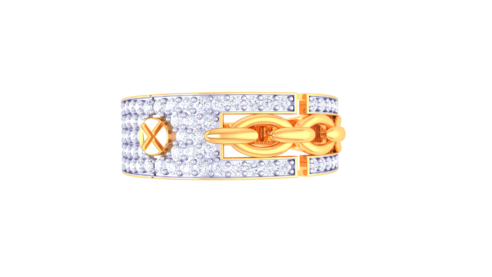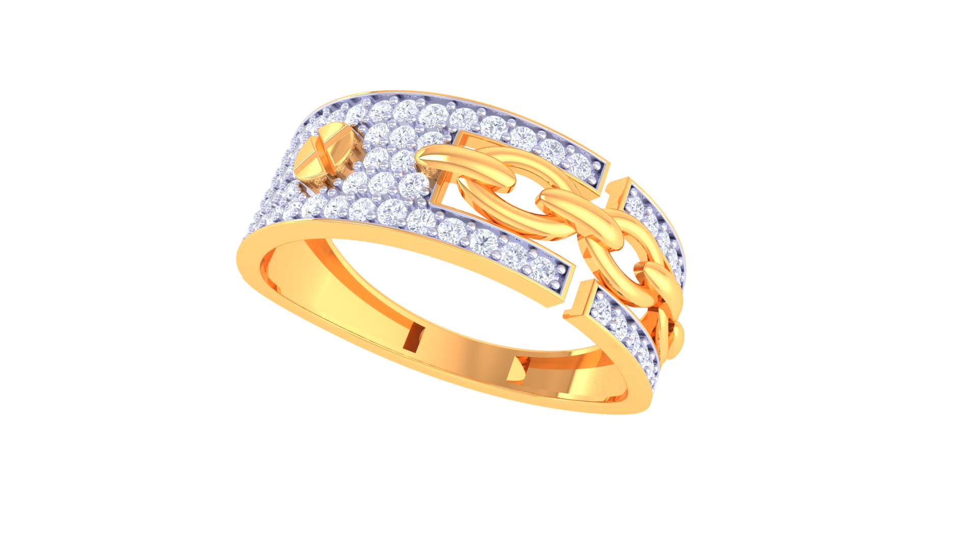 The Éclat Chaîne Moderne – 0.56ct Diamond Gold Ring showcases a contemporary chain link motif set against pavé diamonds in 18kt gold (3.05g). Its architectural design and bold contrast bring a unique balance of edge and refined artistry to any collection.