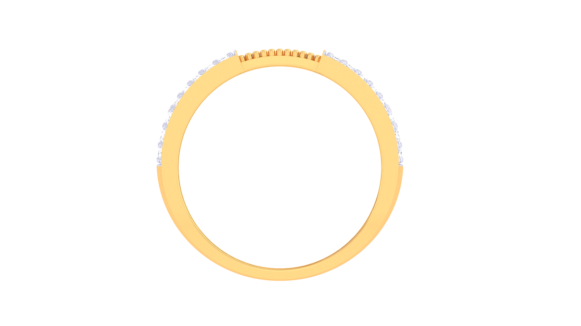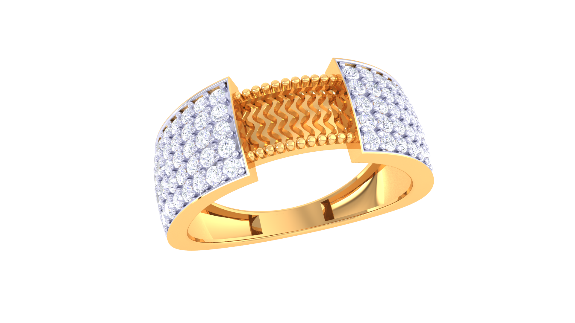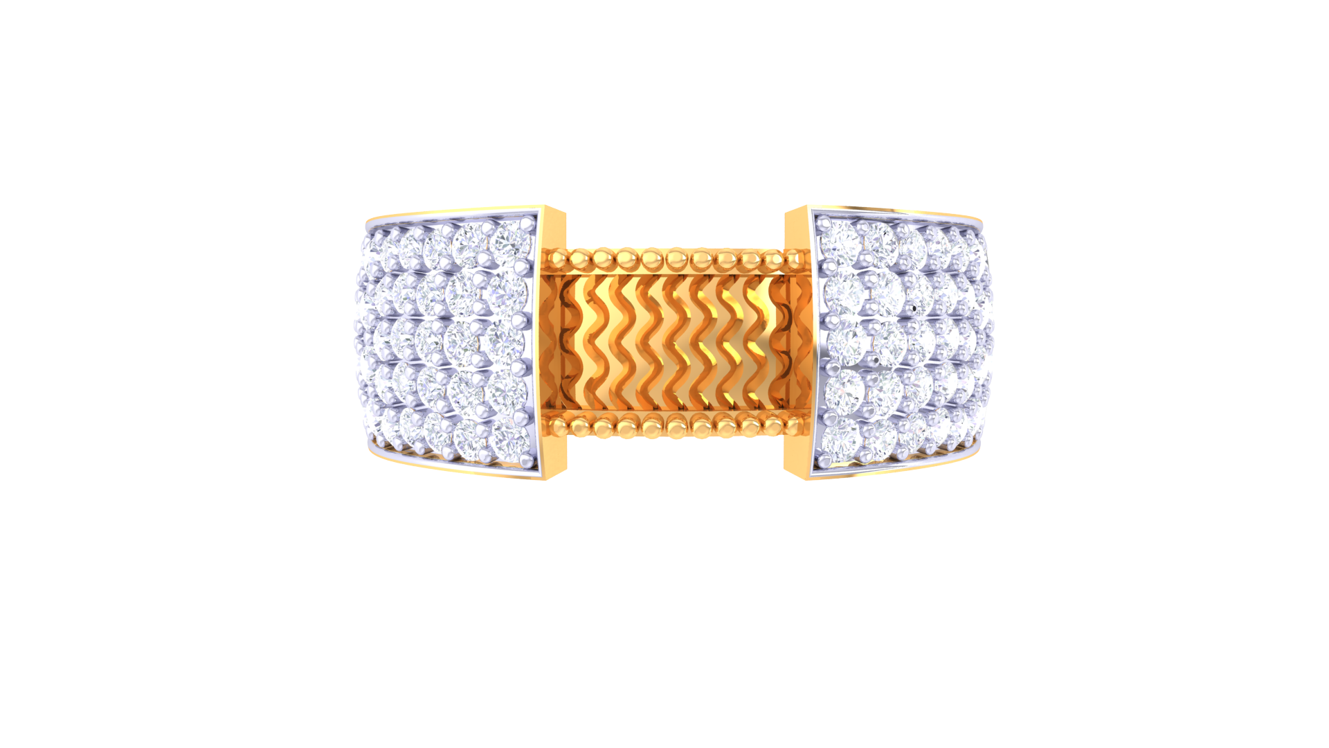 Forged from 5.47 grams of 18kt gold, the Éclat Arête Moderne ring features twin pavé panels of round diamonds totaling 0.8ct, joined by a sculpted gold ridge with striking zigzag texture. This contemporary design pairs bold geometry with radiant sparkle for a dramatic, modern statement.