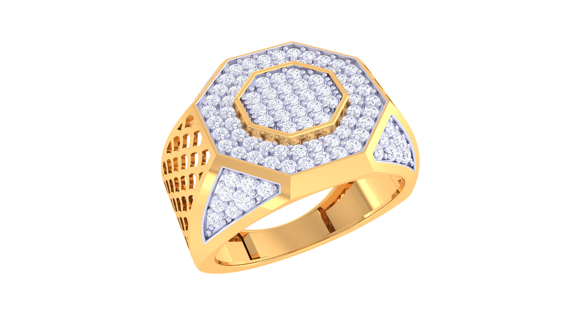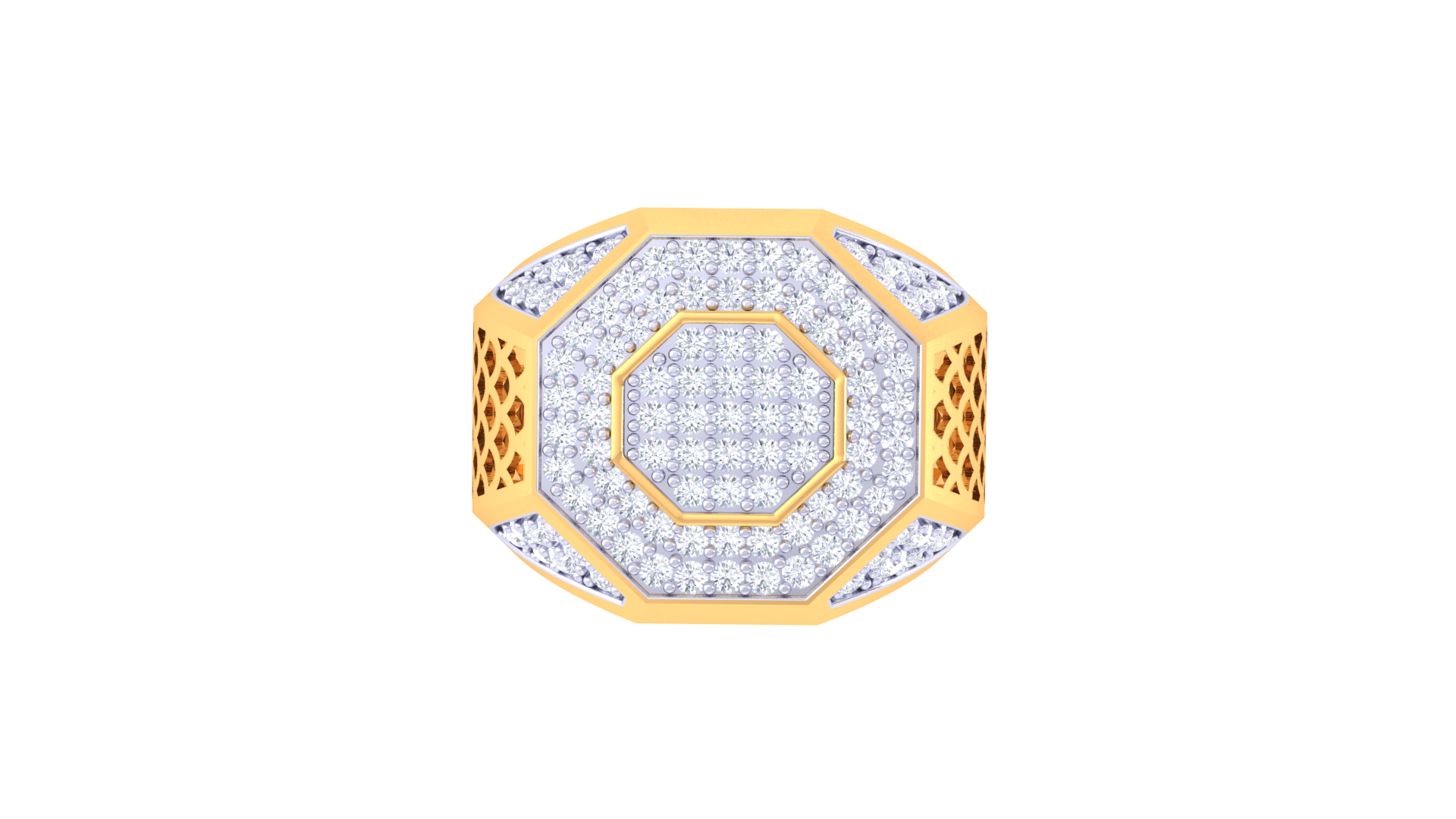 Éclat Octogone Prestige is crafted in 8.47 grams of 18kt gold, spotlighting an octagonal array of round pavé diamonds with a total weight of 0.86ct. Bold geometric borders and intricate side textures give this ring an unmistakable modern identity, balancing artistry with distinctive brilliance.