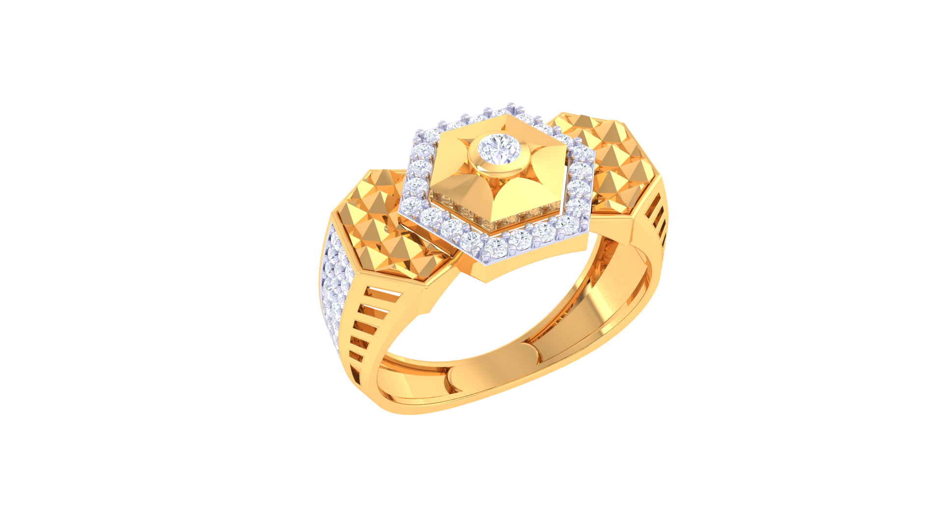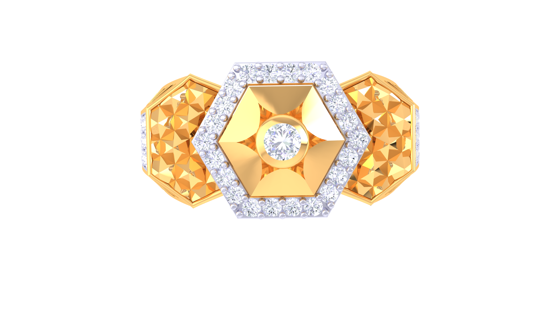 Iconique Hexa Signature is sculpted in 7.15 grams of 18kt gold, showcasing a single round 0.5ct diamond framed in a sleek hexagonal halo. The faceted gold sides and crisp geometric lines deliver a modern twist on classic solitaire style, blending purity and iconic form.