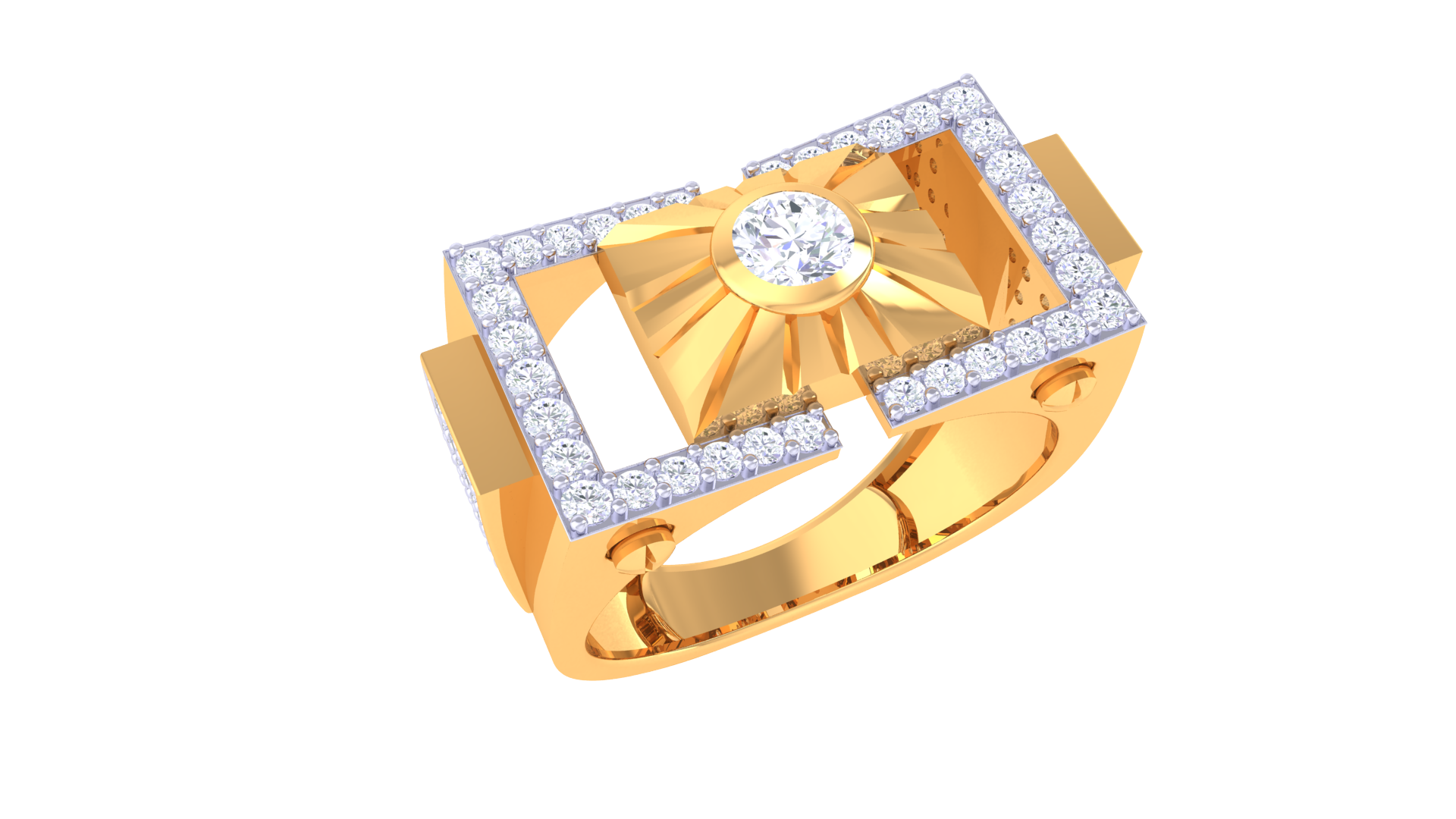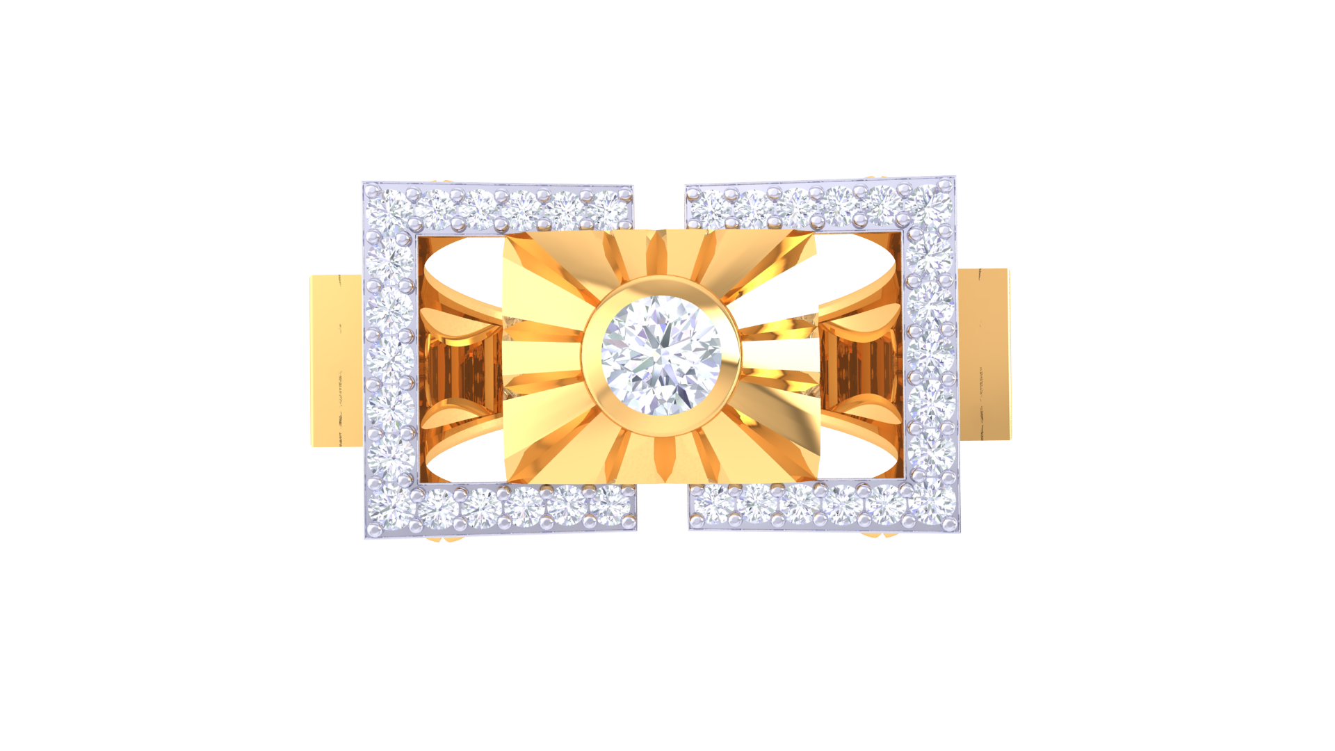 Éclat Solstice Structure radiates bold luxury, crafted in 10.25 grams of 18kt gold and featuring a brilliant round center diamond framed by rectangular rays and pavé accents for a total of 0.86ct. Its striking geometric silhouette and intricate contrast ensure a modern, statement-making appeal.