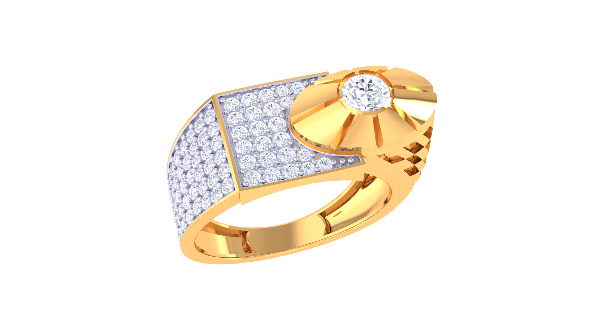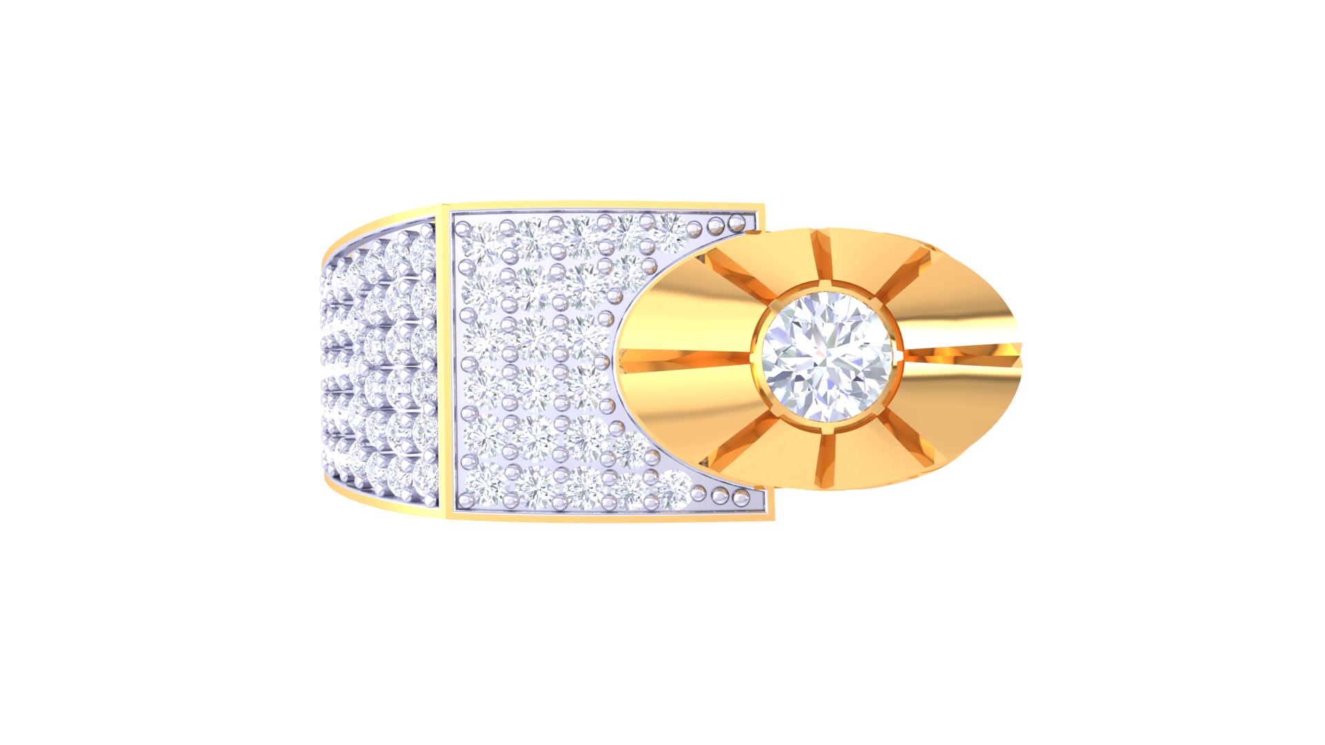Lumière Radiant Axis – 0.84ct Diamond Gold Ring blends a brilliant pavé diamond band with a modern gold centerpiece, showcasing a striking round diamond at its core. The interplay of linear polish and sparkling facets creates a bold sense of luminosity, offering elevated shine and refined elegance for contemporary tastes.