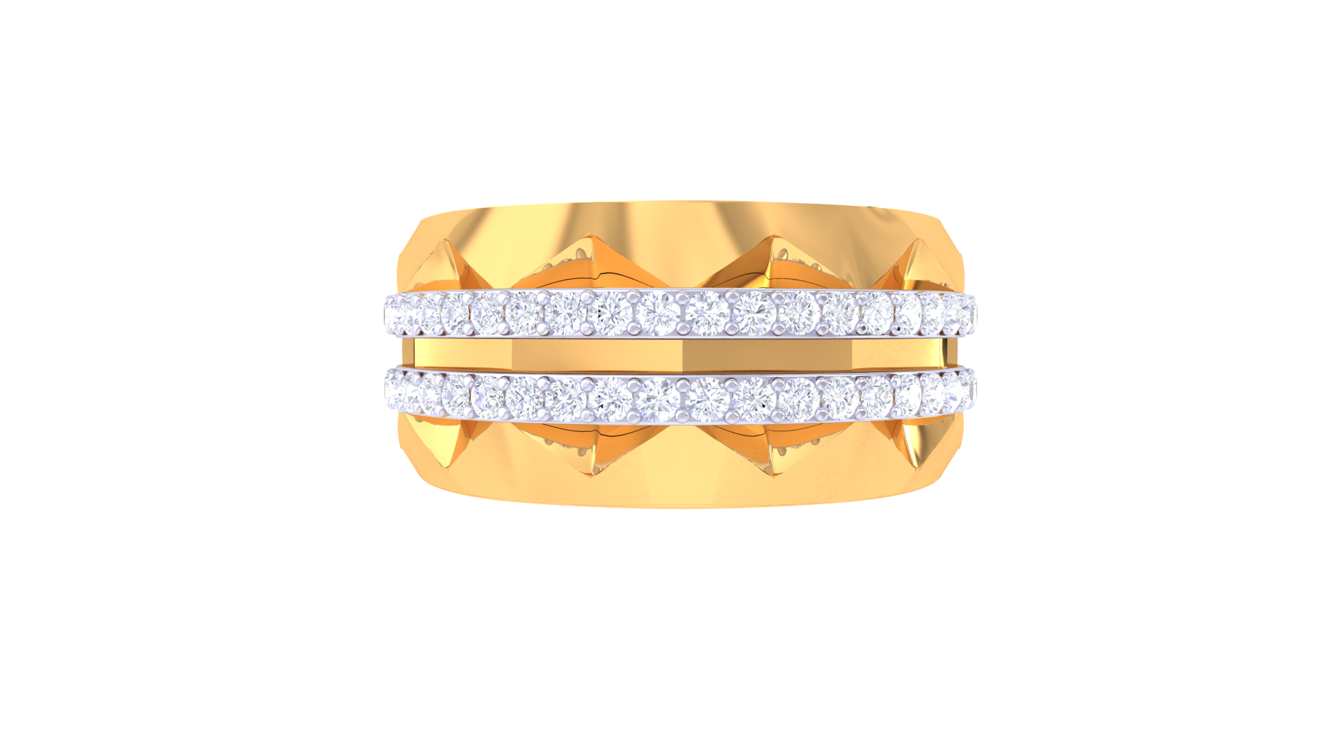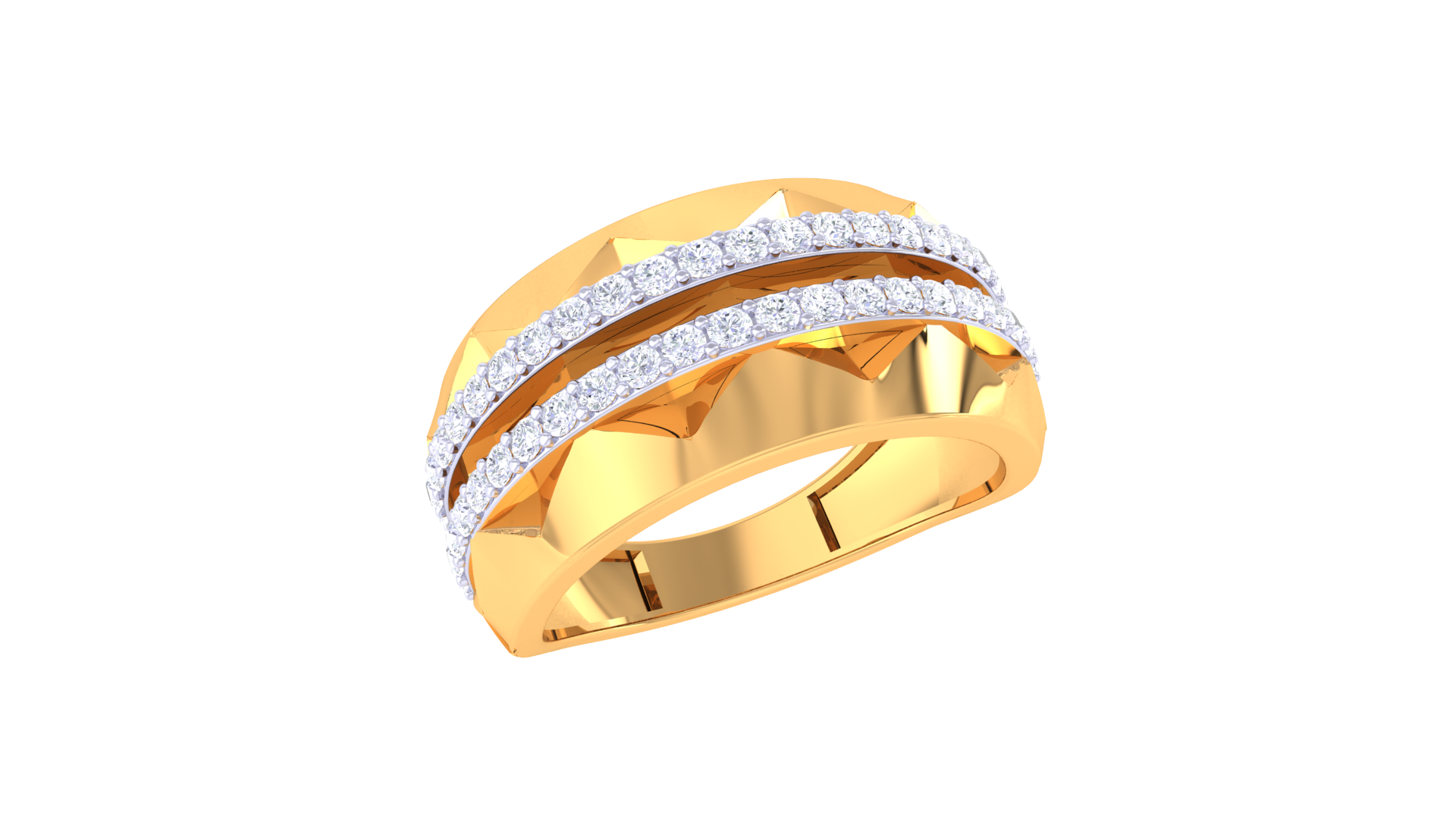 Sculpted from 8.07 grams of 18kt gold, the Lumière Double Éclat ring dazzles with two radiant rows of pavé-set round brilliant diamonds, totaling 0.59ct. The boldly faceted gold band amplifies every glimmer, making this piece a luminous statement in modern luxury.