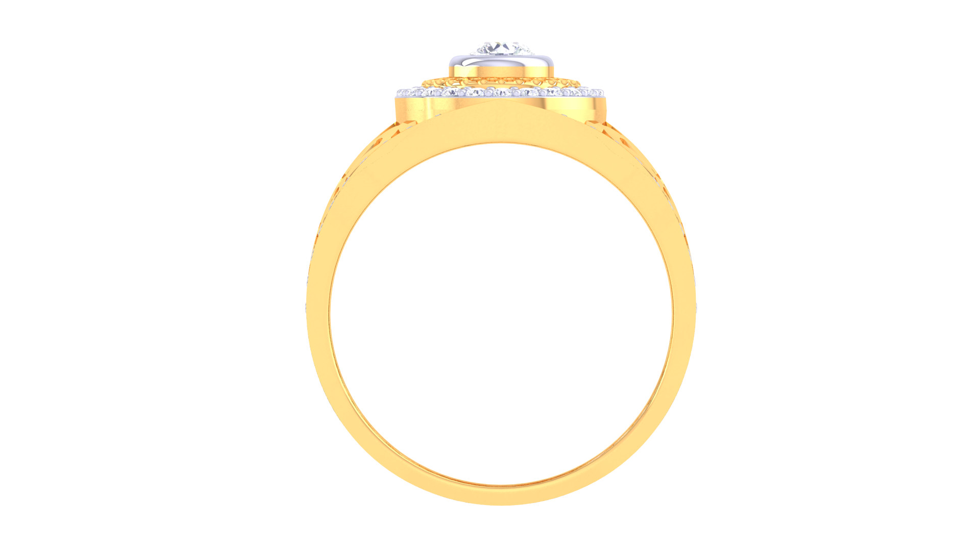 Trilune Halo Courbure – 0.76ct Diamond Gold Ring highlights a luminous round diamond (0.76ct), encircled by a crafted halo and intricate pavé accents, set in 18kt gold weighing 6.86 grams. Distinctive geometric cutwork frames the radiant center, creating a statement of elegant movement and artistic luxury for modern collections.