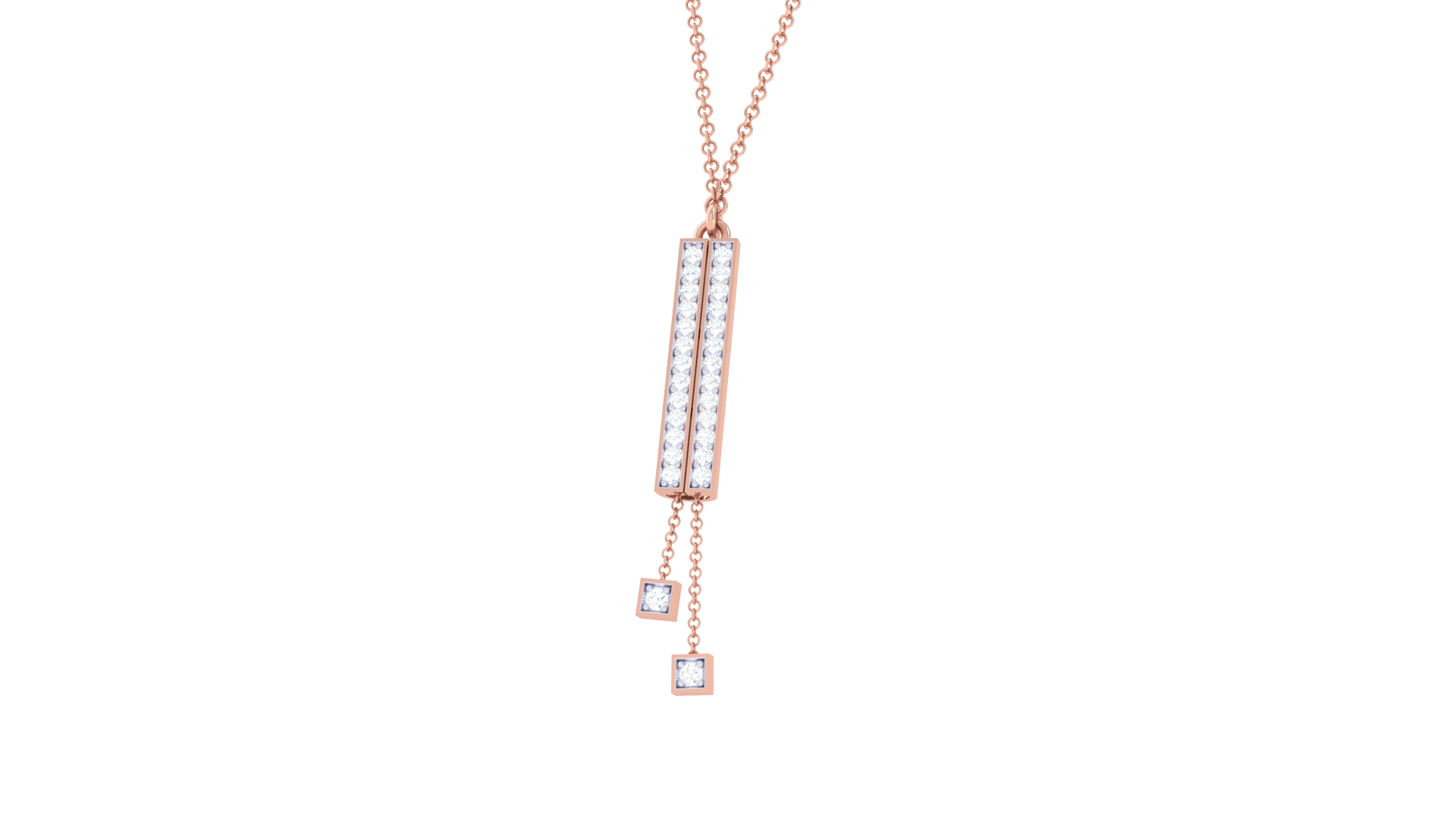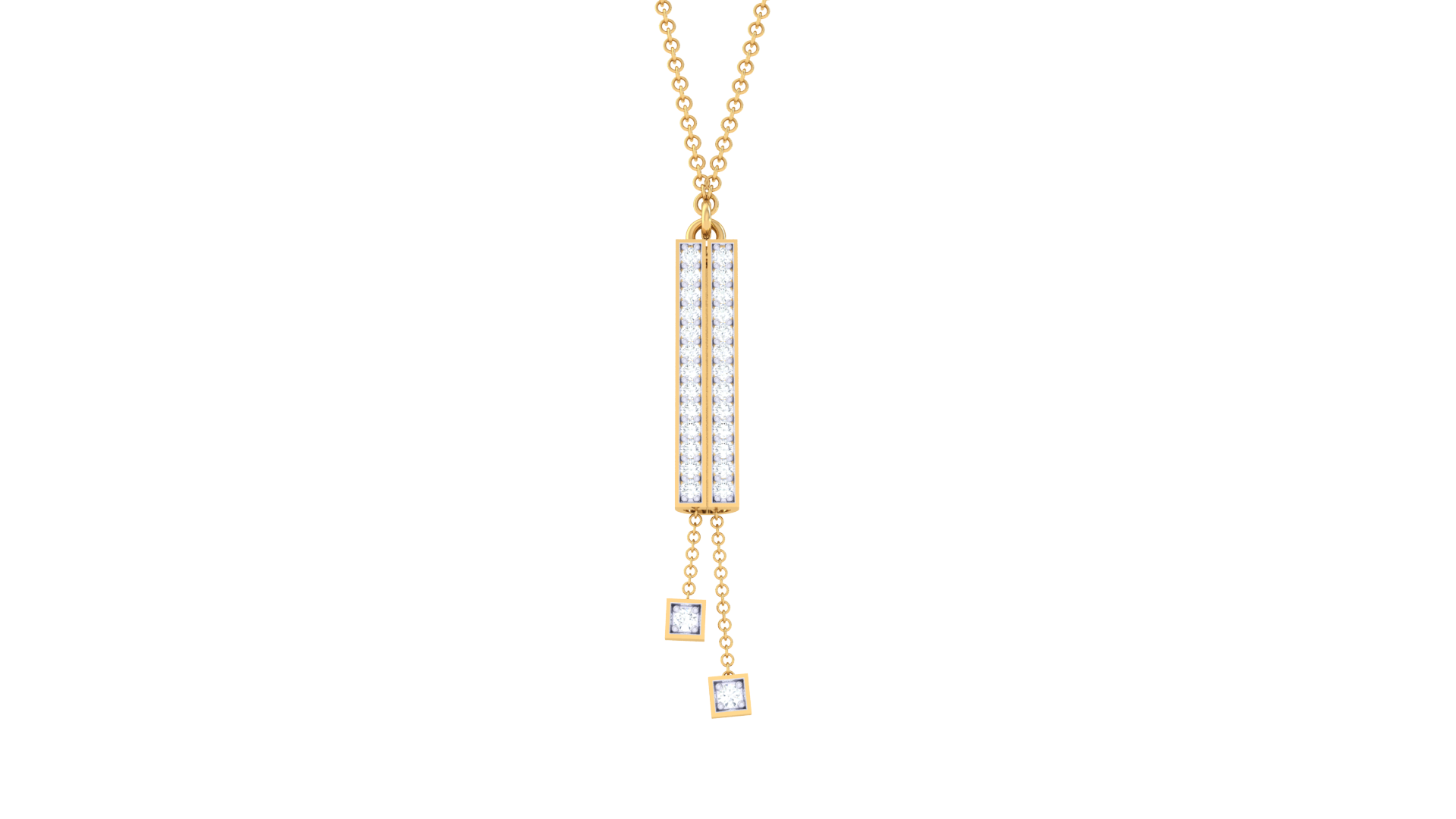 Two delicate gold chains descend from the base, each ending in a square diamond setting, adding graceful movement and geometric charm.