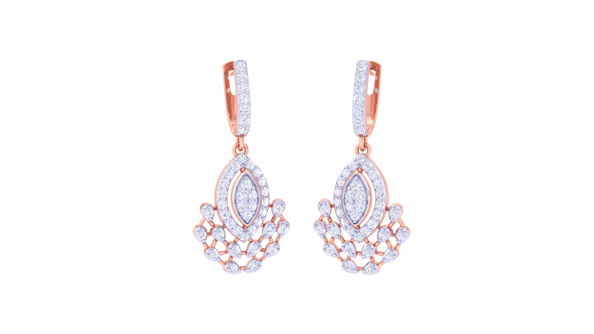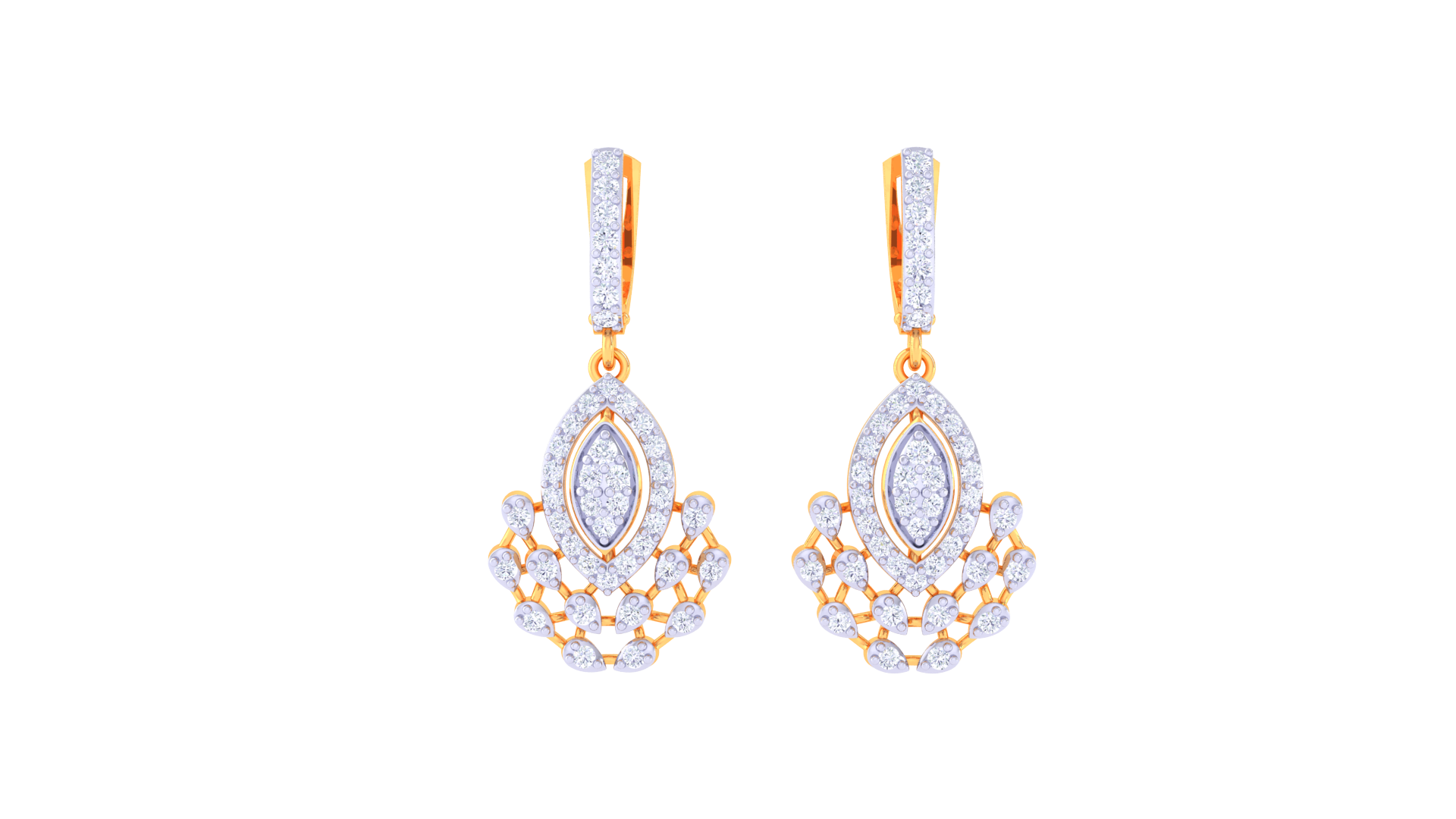 Gracefully sculpted in 3.84 grams of luminous gold, these elegant drop earrings feature a marquise-shaped diamond cluster framed in a teardrop outline, cascading into a fan-like arrangement of sparkling accents.