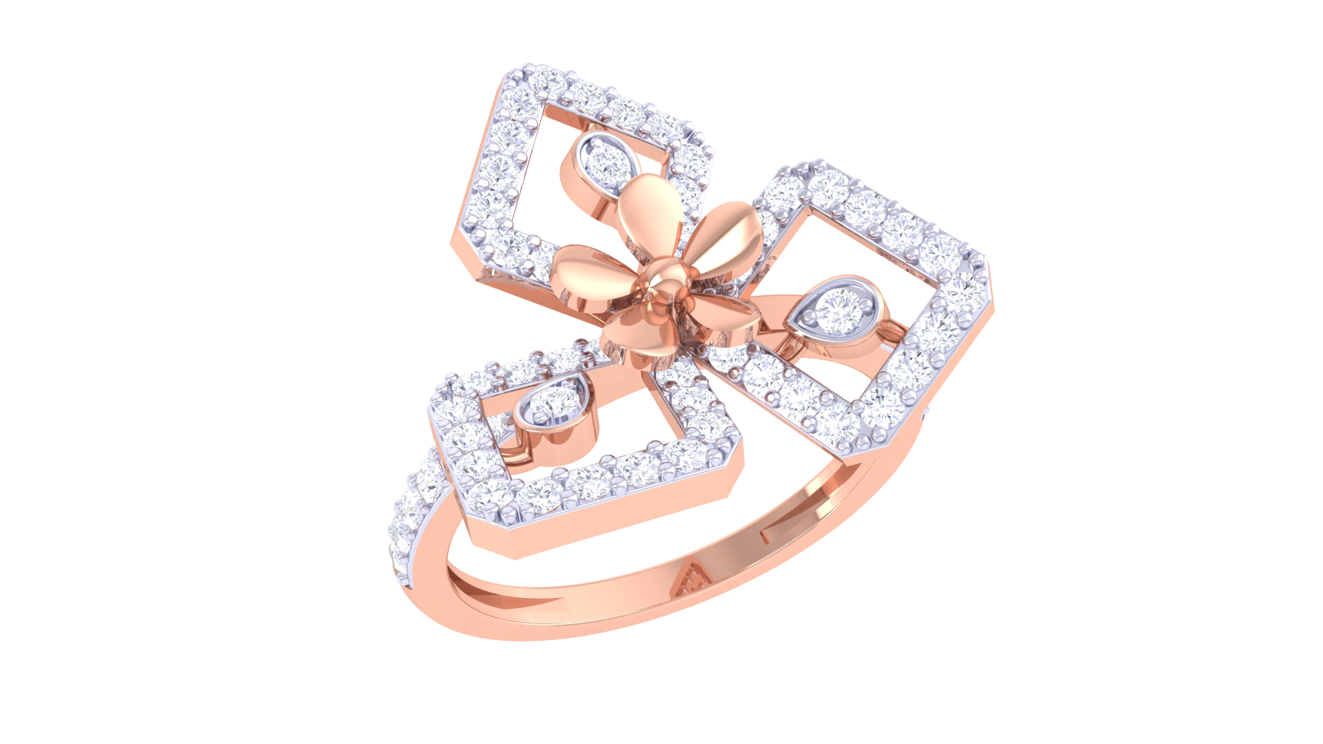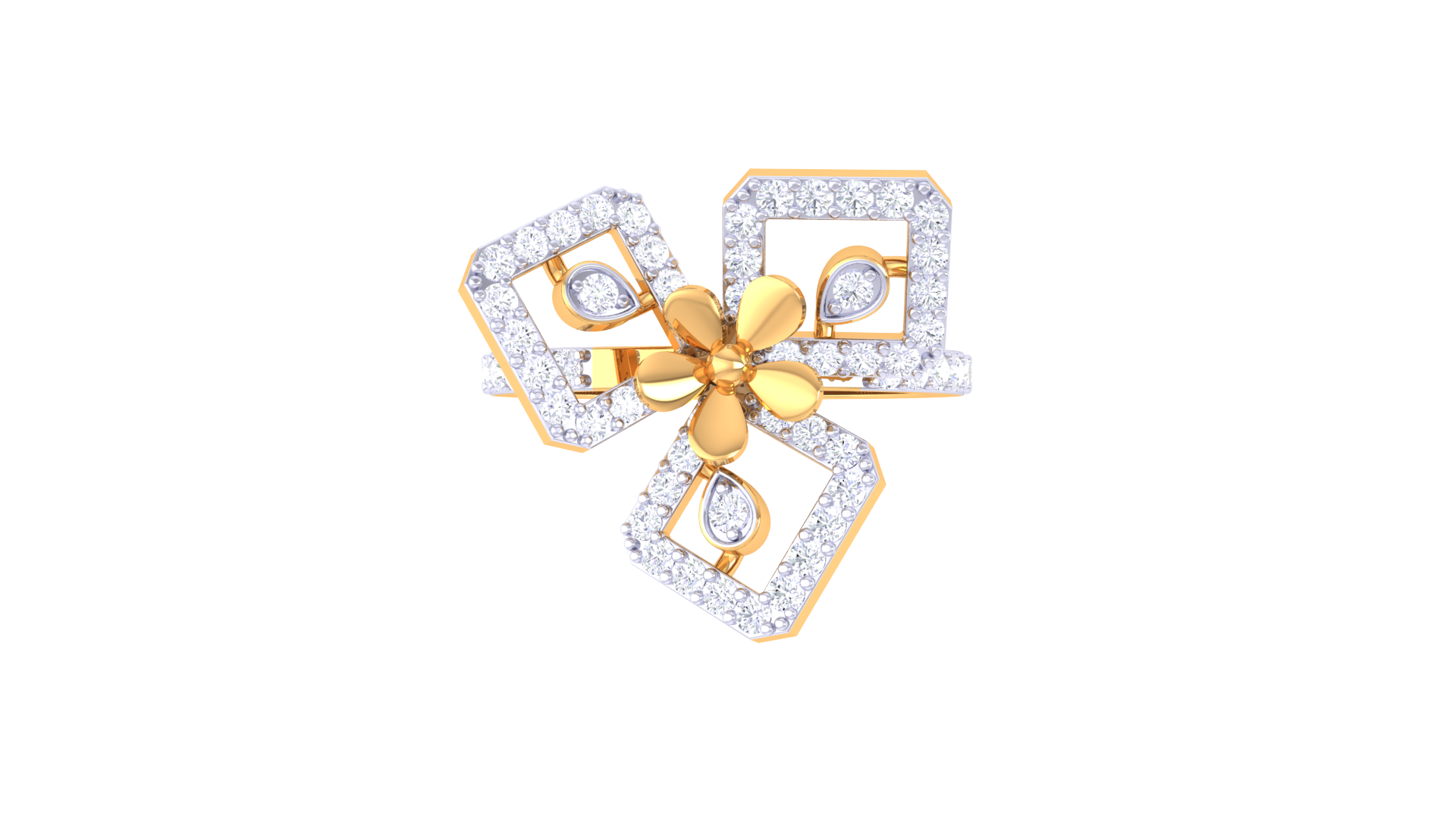Surrounding the bloom are three open diamond-shaped frames, each adorned with pavé-set white diamonds and a teardrop-shaped gem at its heart.