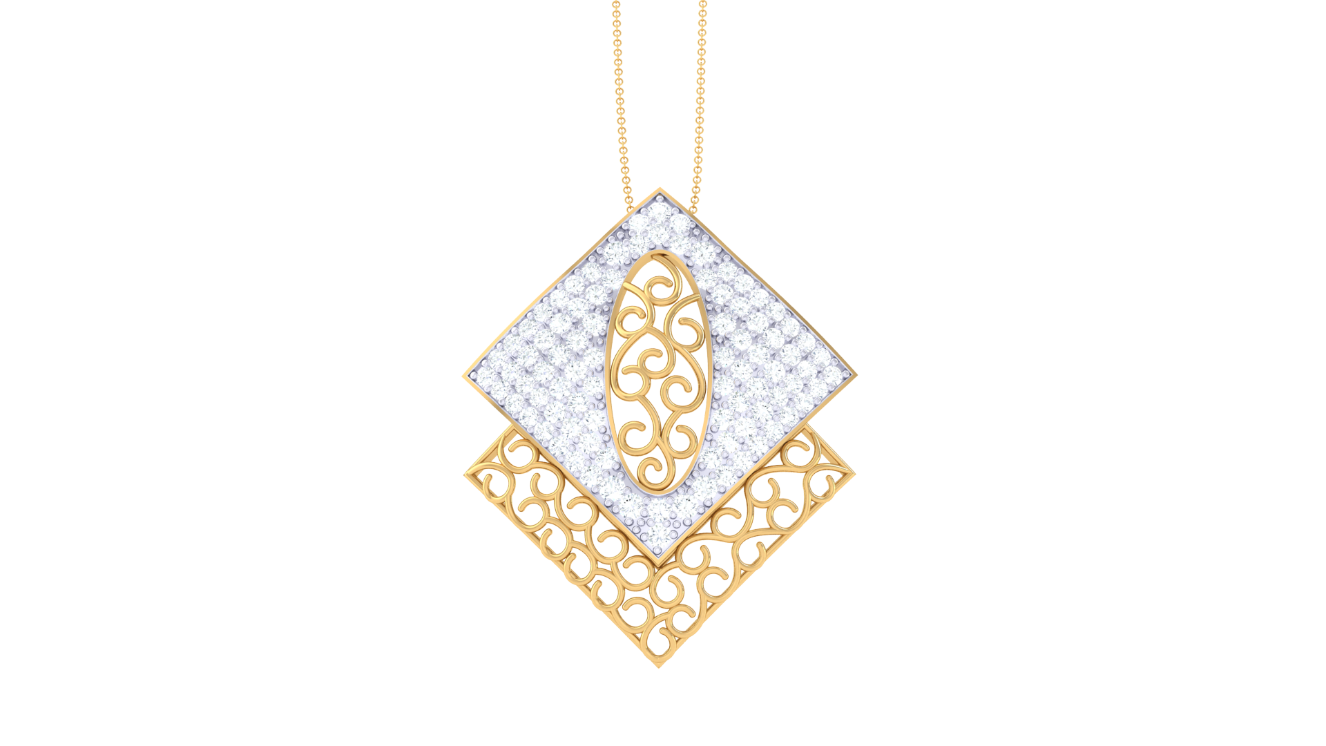 Beneath, a matching gold filigree layer adds depth and symmetry, suspended from a sleek gold chain for timeless sophistication.