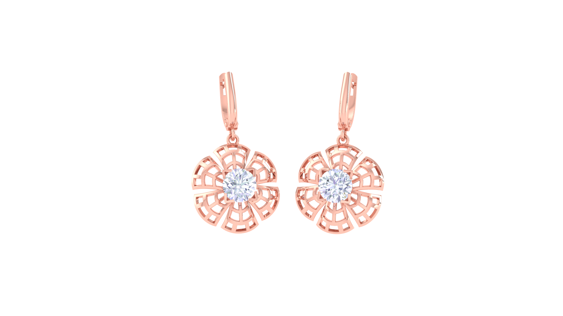 Each piece features a symmetrical petal design with intricate lattice detailing, gracefully framing a brilliant 0.64 carat diamond at the center.