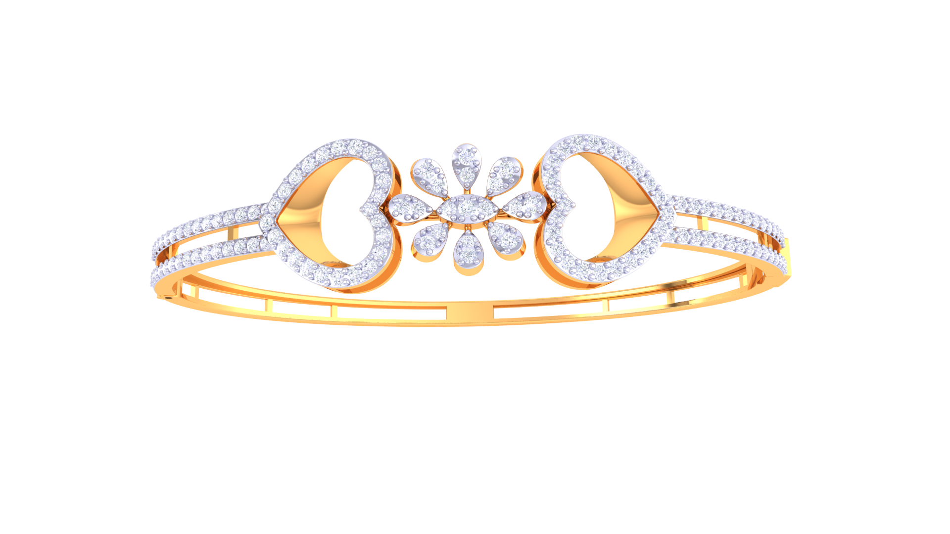 Twin heart-shaped accents, each outlined with shimmering diamonds, frame a central floral motif composed of petal-like stones.
