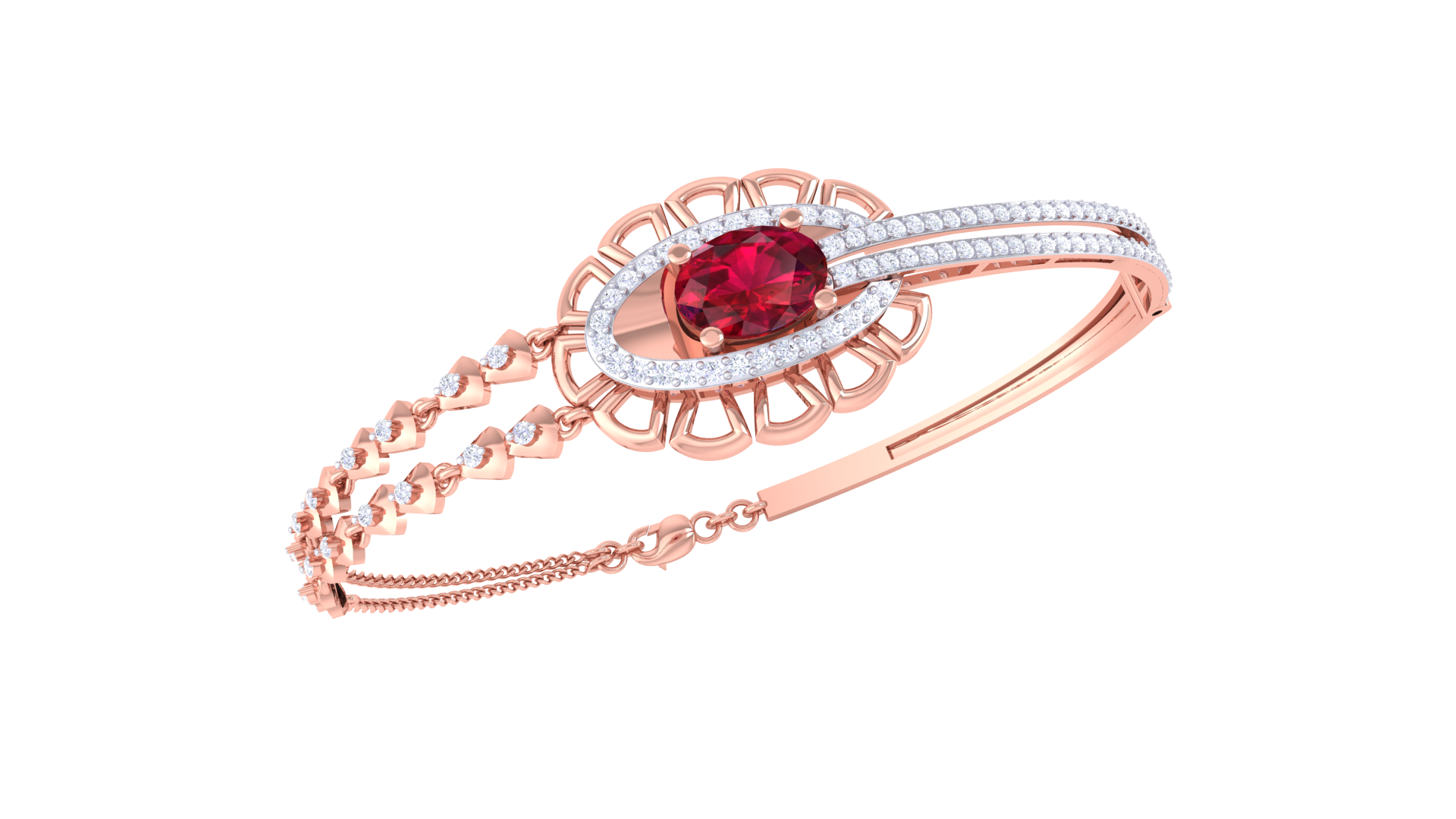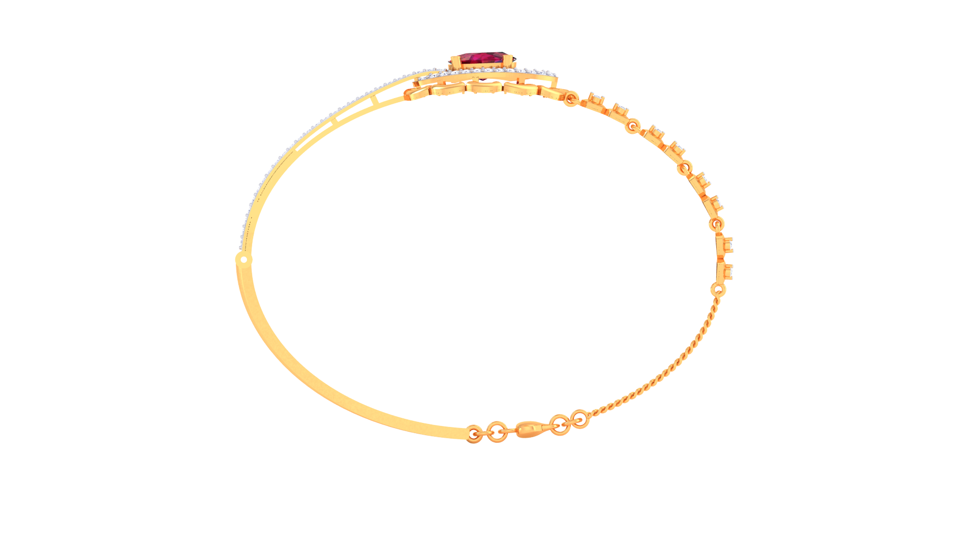 A celebration of regal artistry, this 18K gold bracelet showcases a vivid ruby centerpiece embraced by 0.68 carats of shimmering white diamonds.