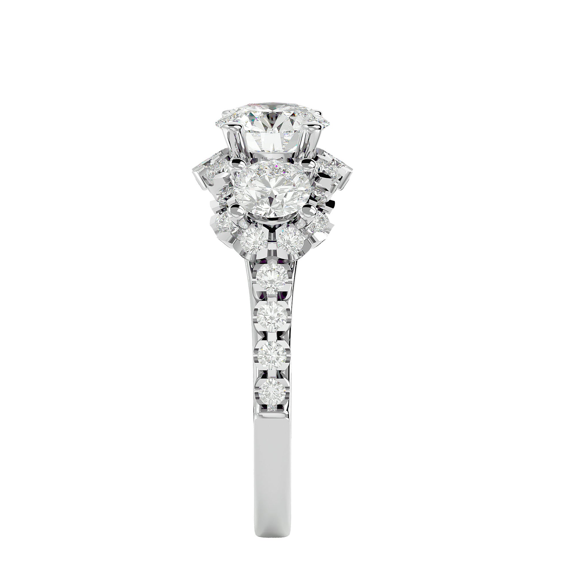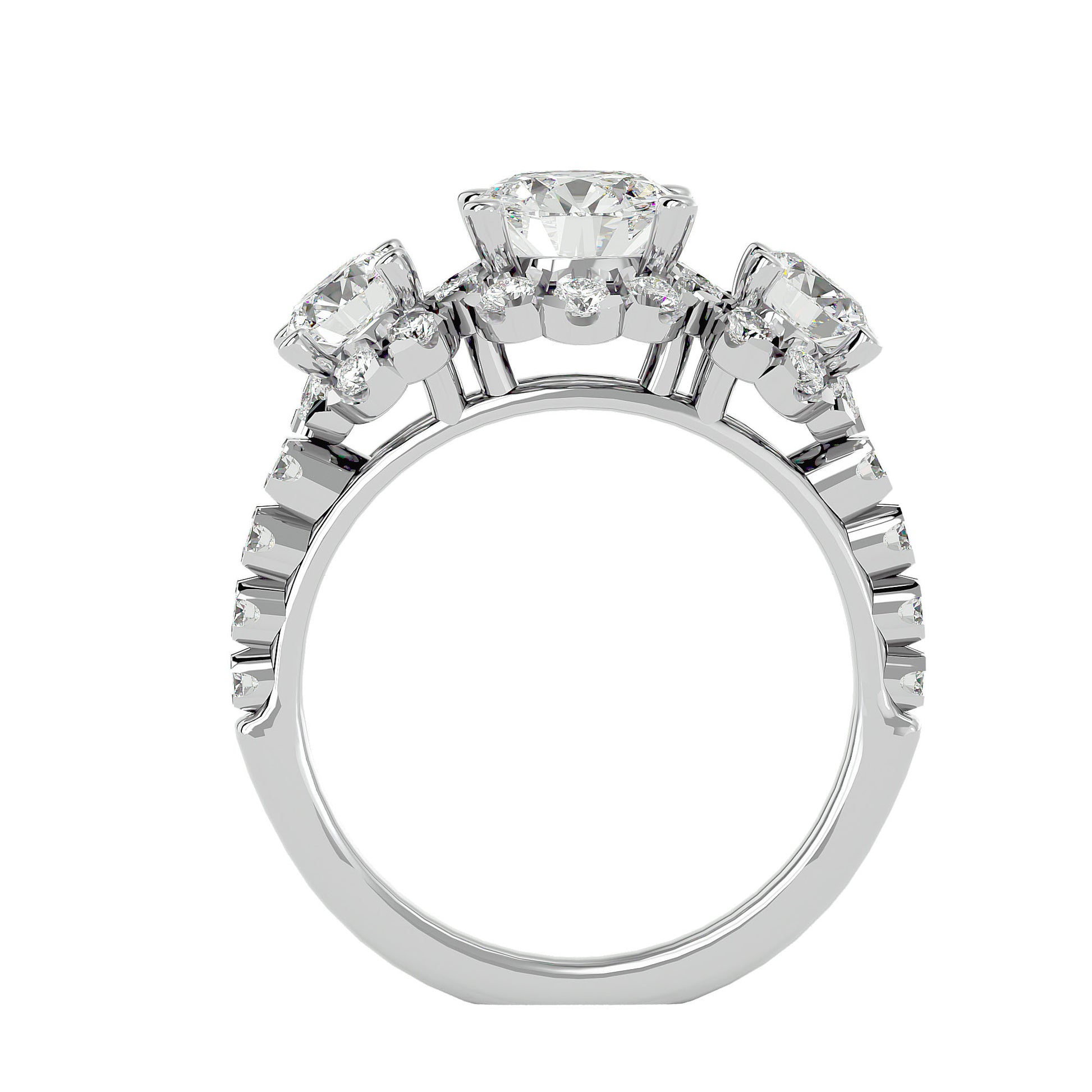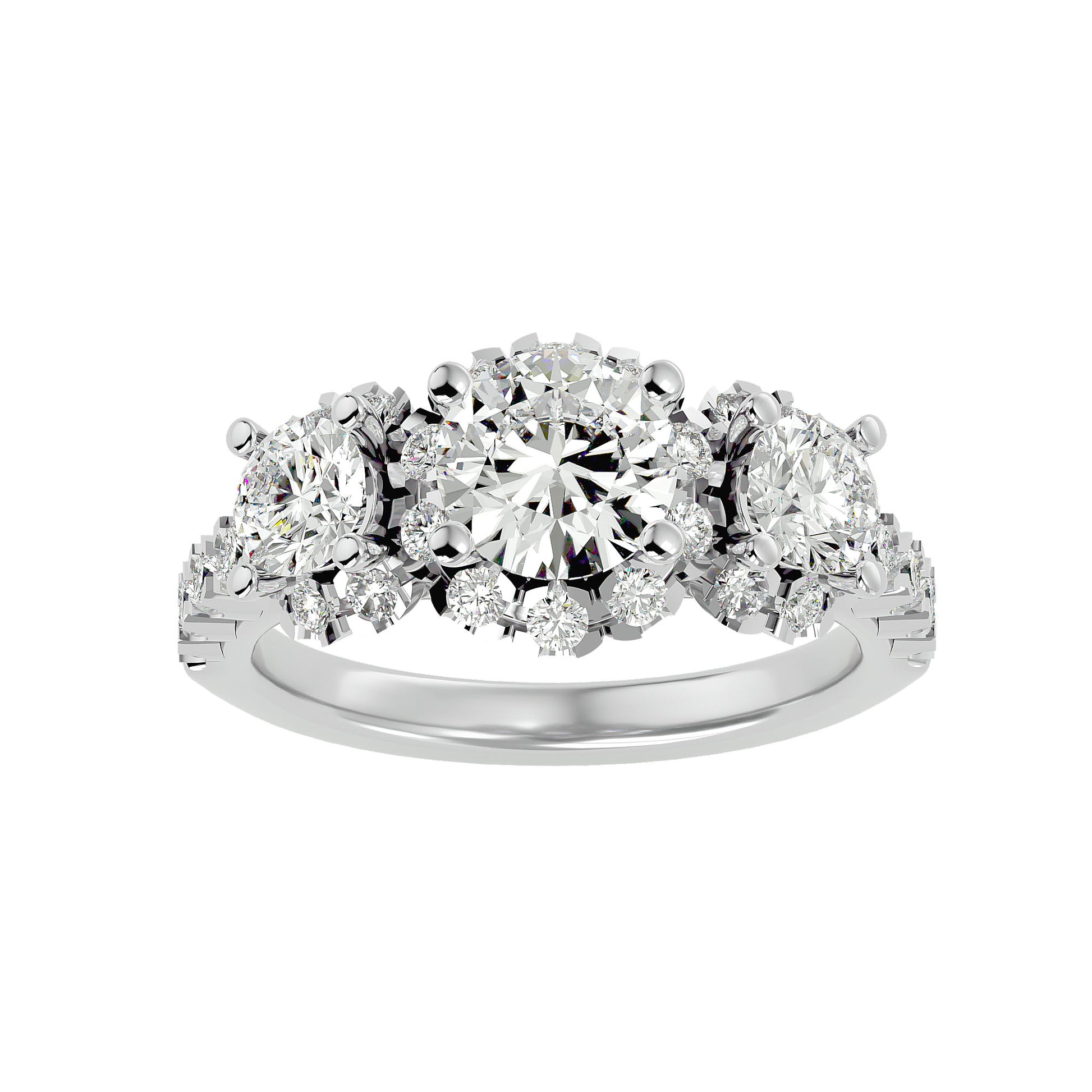 Elevate your elegance with the Trilune Constellation Three-Stone ring, featuring a total of 2.044 carats of dazzling round diamonds with EF color and VS+ clarity set in 4.34 grams of refined 14kt gold.