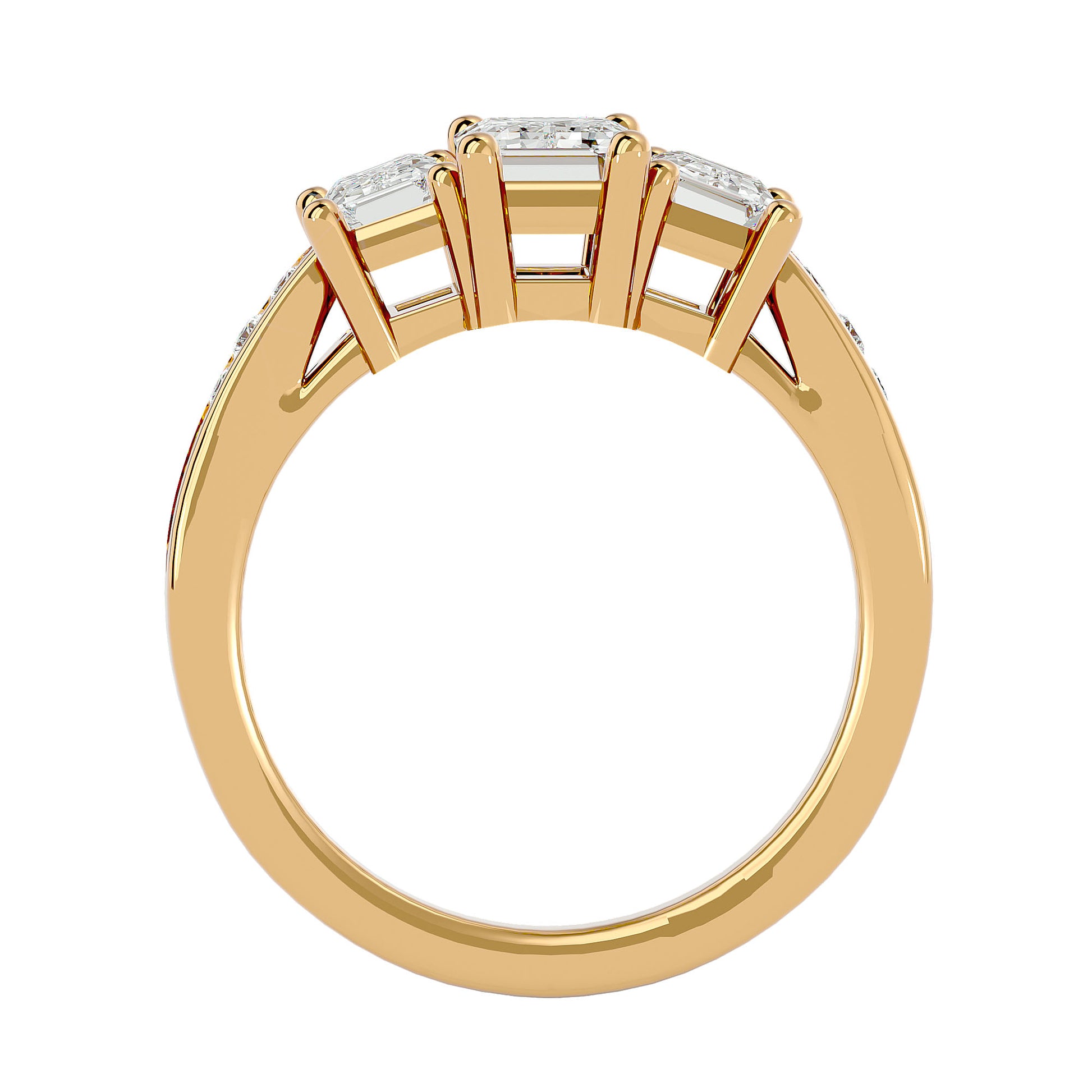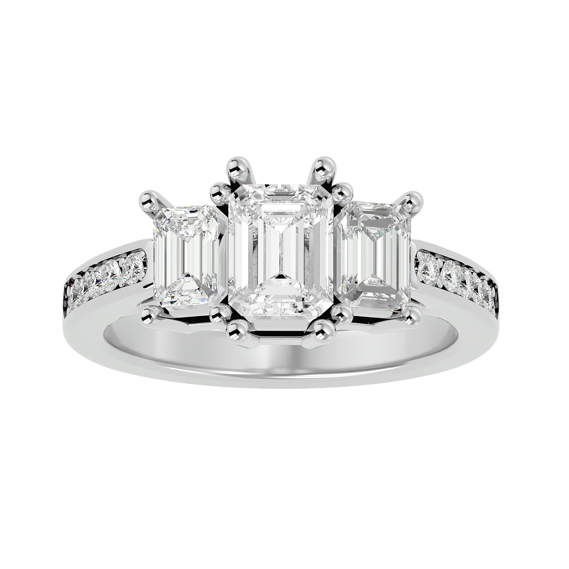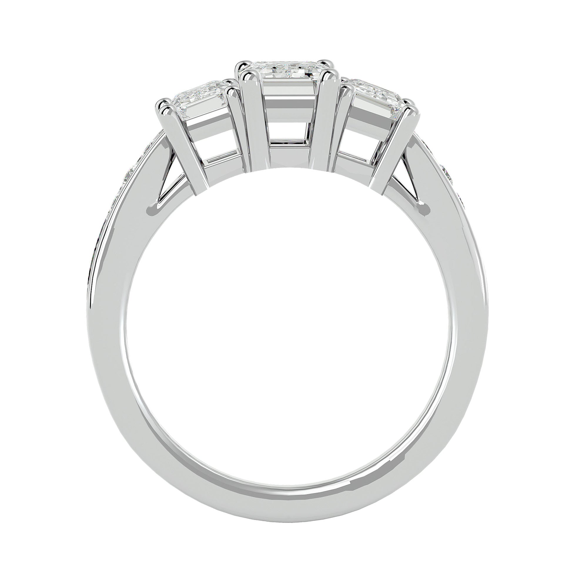 The Trilune Orbe Floating Trio ring features approximately 2.46 carats of exquisite emerald-cut diamonds, accented by elegantly crafted round diamonds.