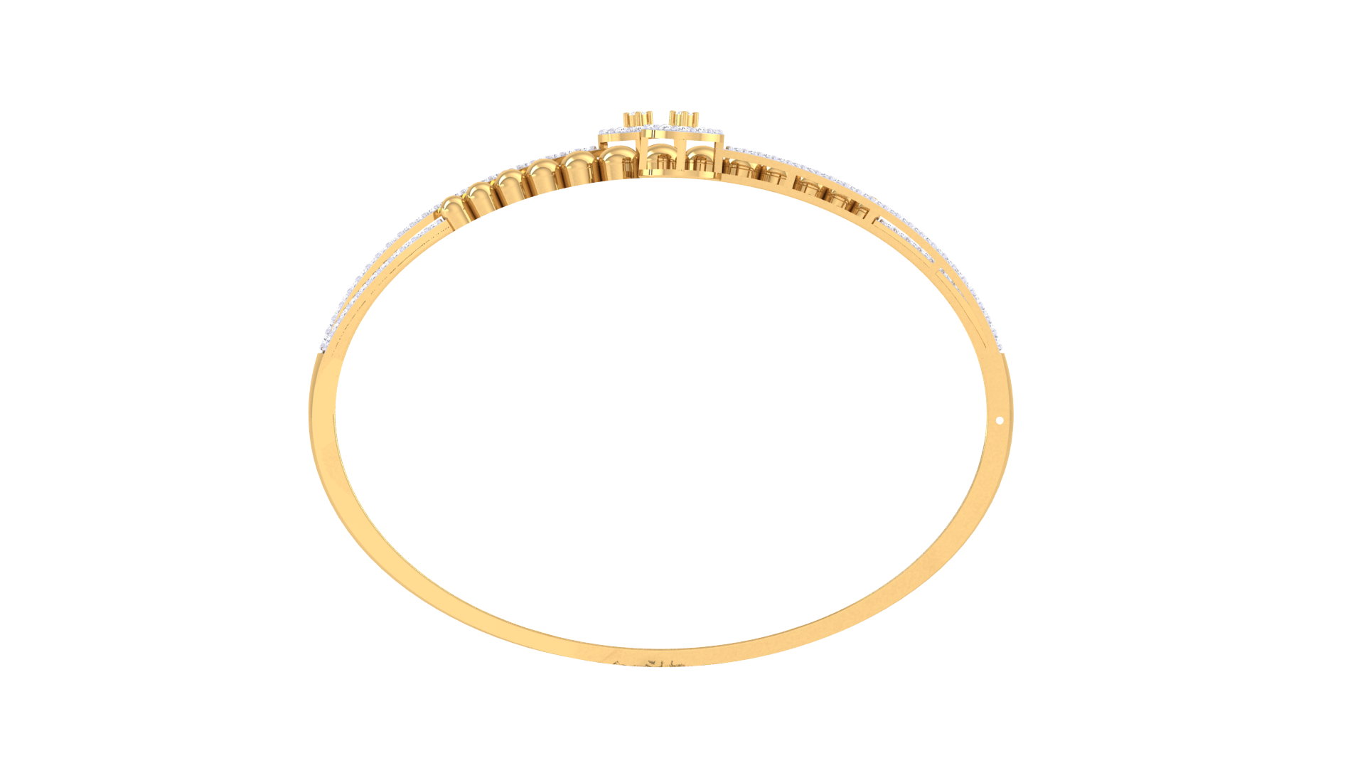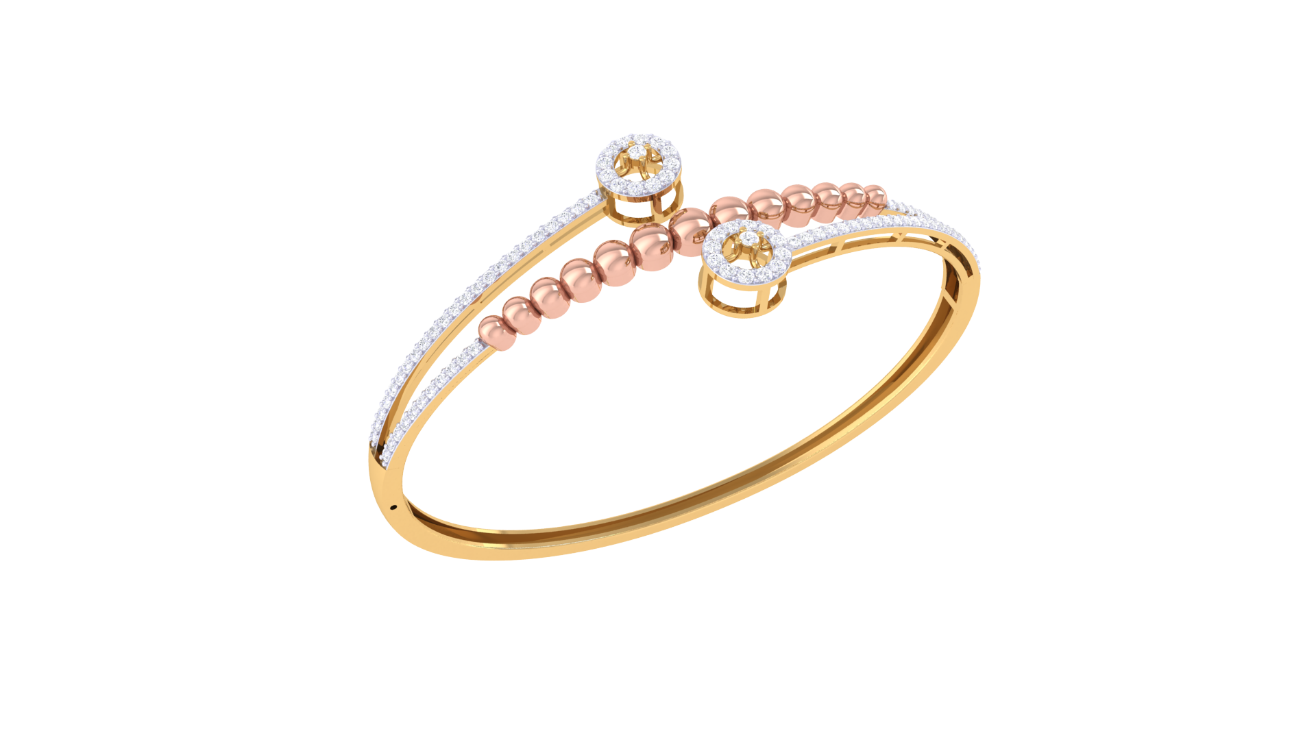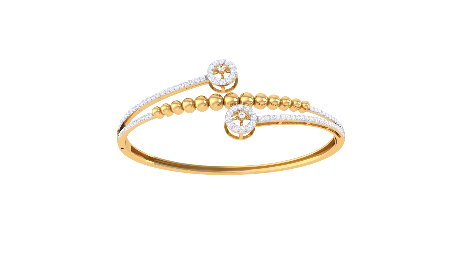 A striking fusion of tradition and modernity, this bangle is crafted from 10.83 grams of radiant gold, featuring a dual-band silhouette adorned with polished gold beads and diamond-studded circular motifs.