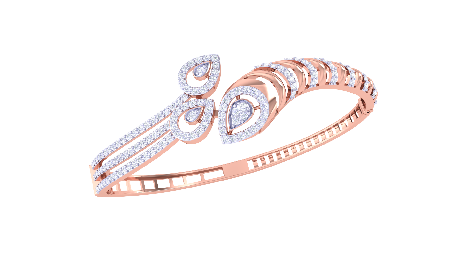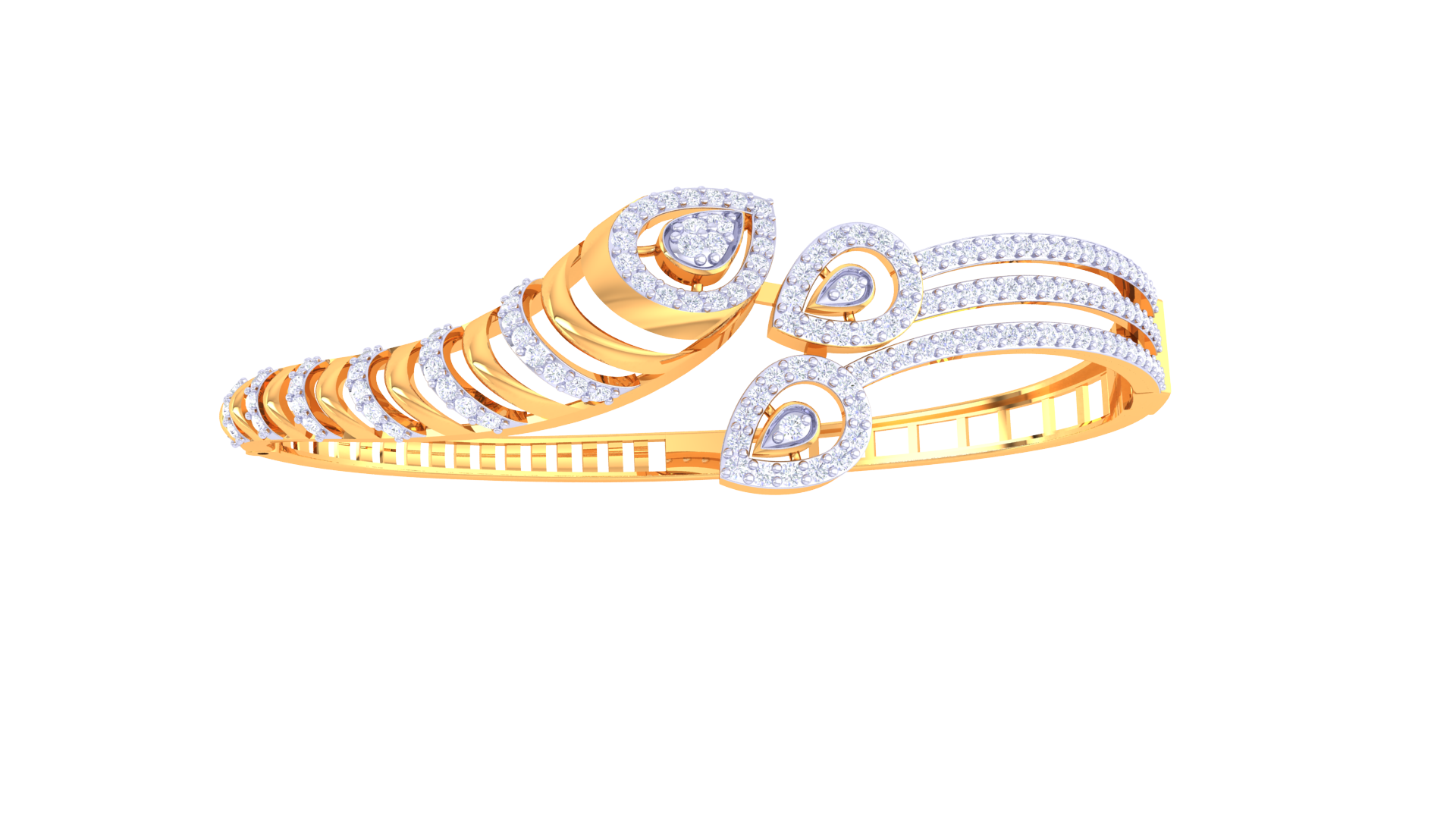 The design flows seamlessly from overlapping gold segments into twin diamond-studded bands, converging at a series of teardrop motifs that shimmer with timeless allure.