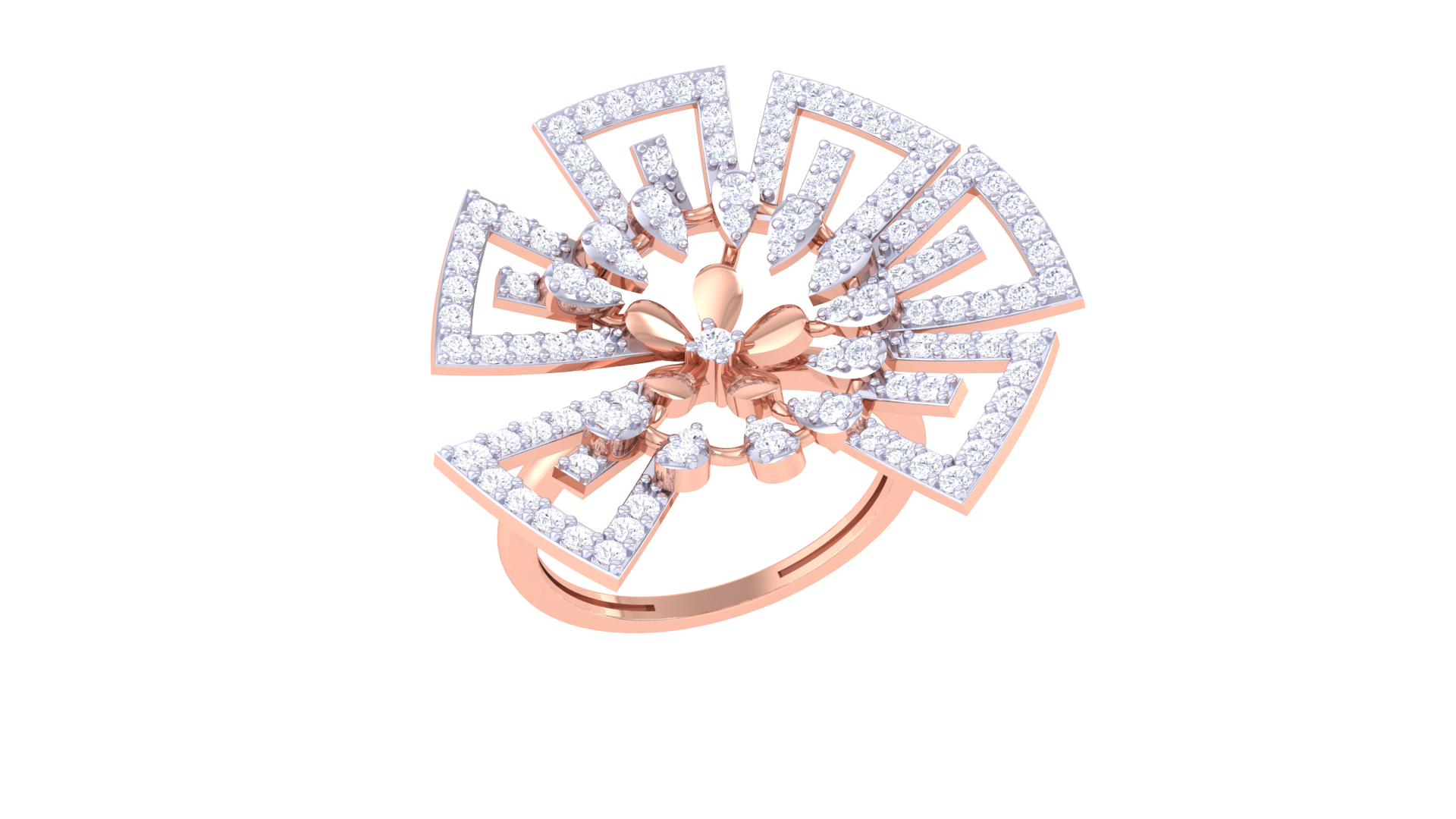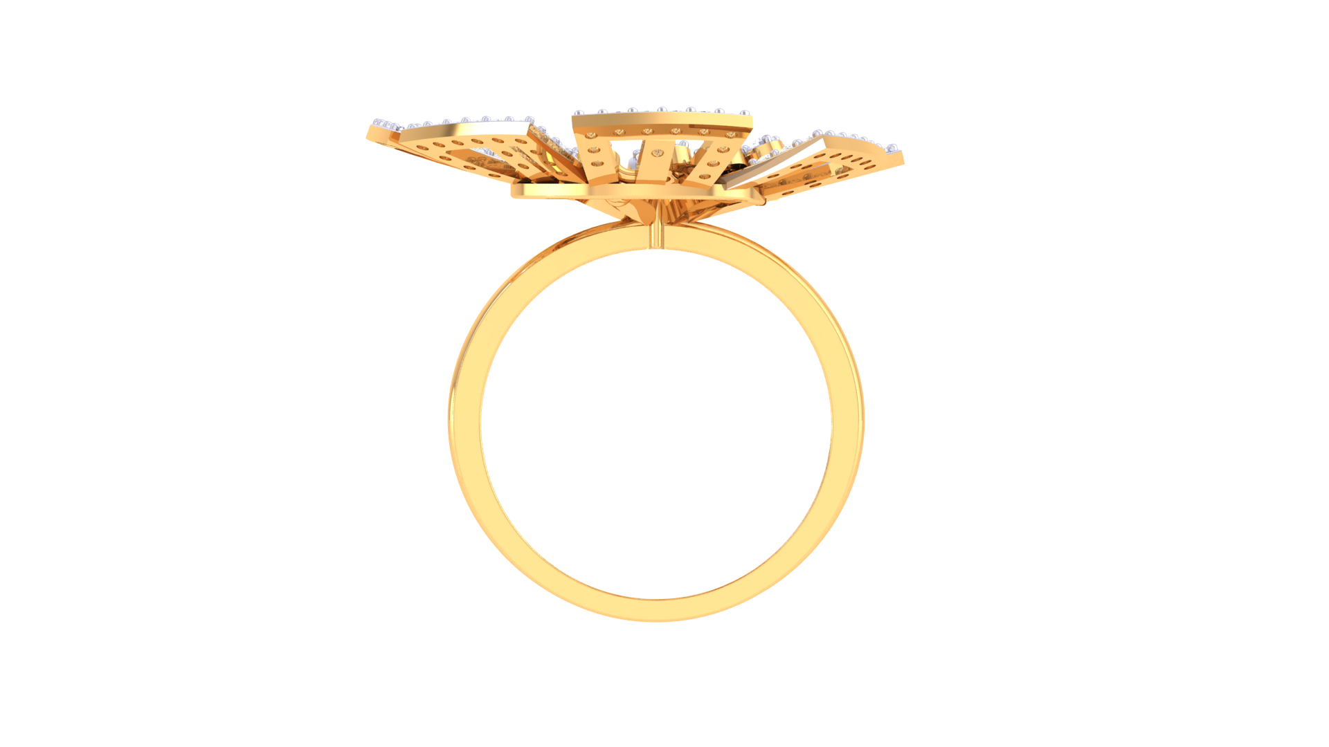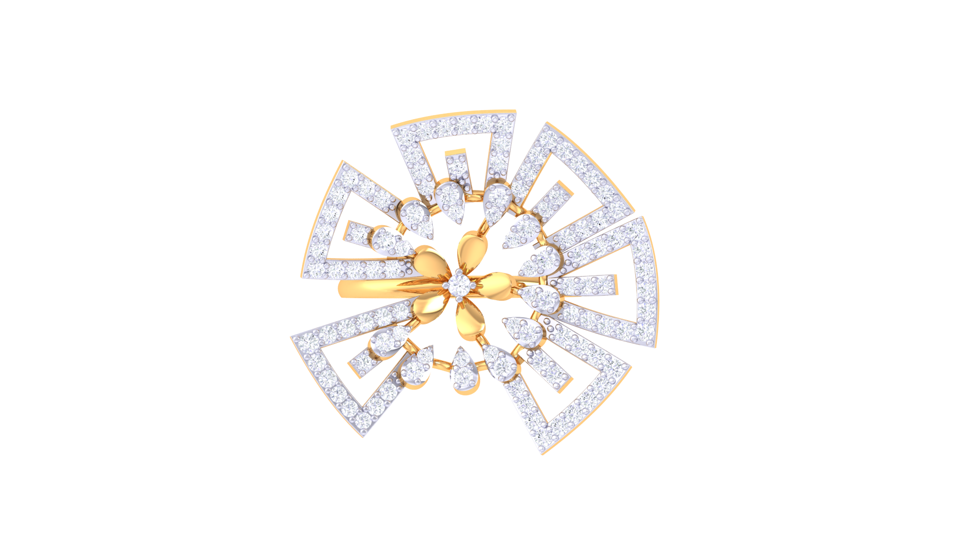 A symphony of geometry and grace, this exquisite ring showcases a radiant floral centerpiece in rich 5.21 grams of gold, encircled by a harmonious arrangement of diamond-studded triangles and brilliant round stones.