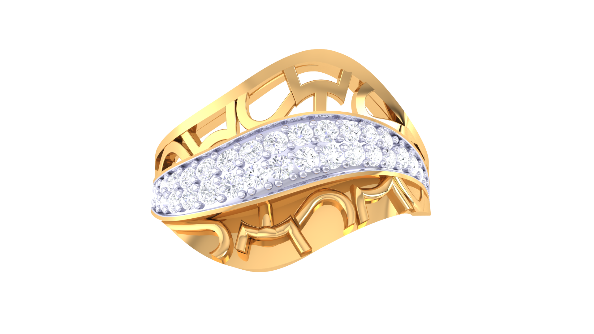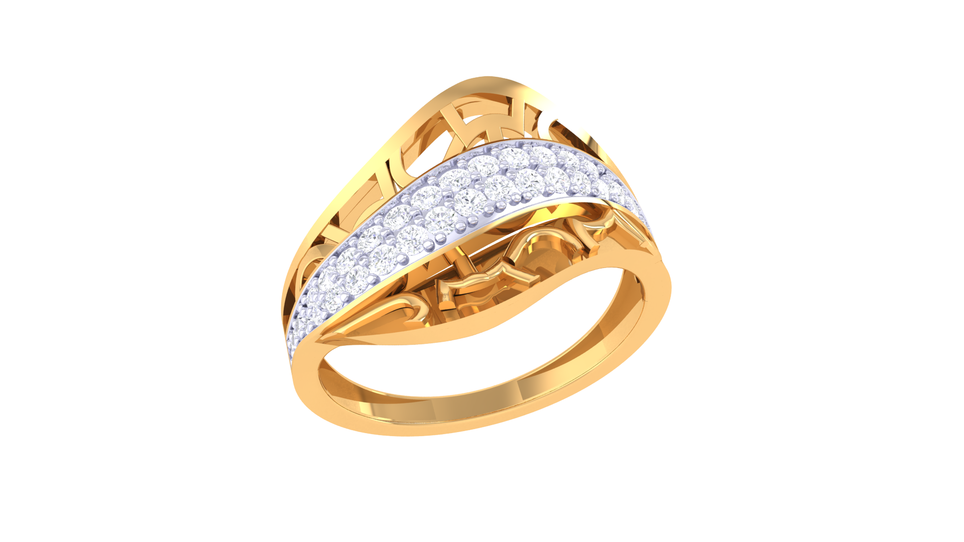 A symphony of structure and sparkle, this intricately crafted gold ring showcases 0.32 carats of round-cut diamonds set in dual parallel rows.