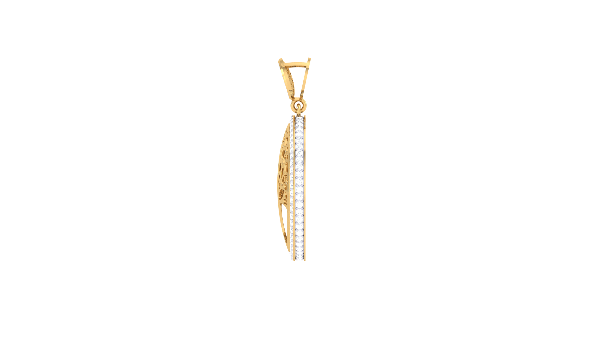 The outer rim sparkles with 0.79 carats of pavé-set diamonds, while a circular diamond-studded bail adds a graceful finishing touch.