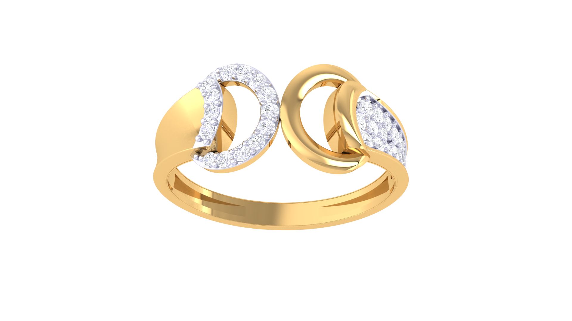 Elegantly crafted in 2.06 grams of polished gold, this sculptural ring features two interlocking loops encrusted with 0.21 carats of shimmering diamonds.