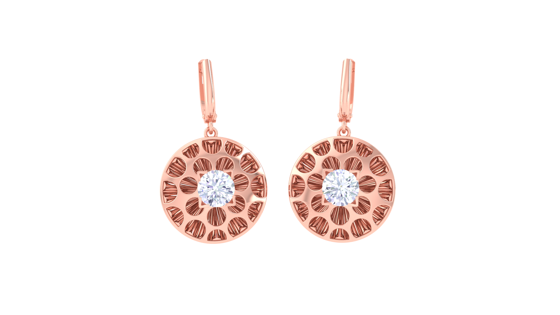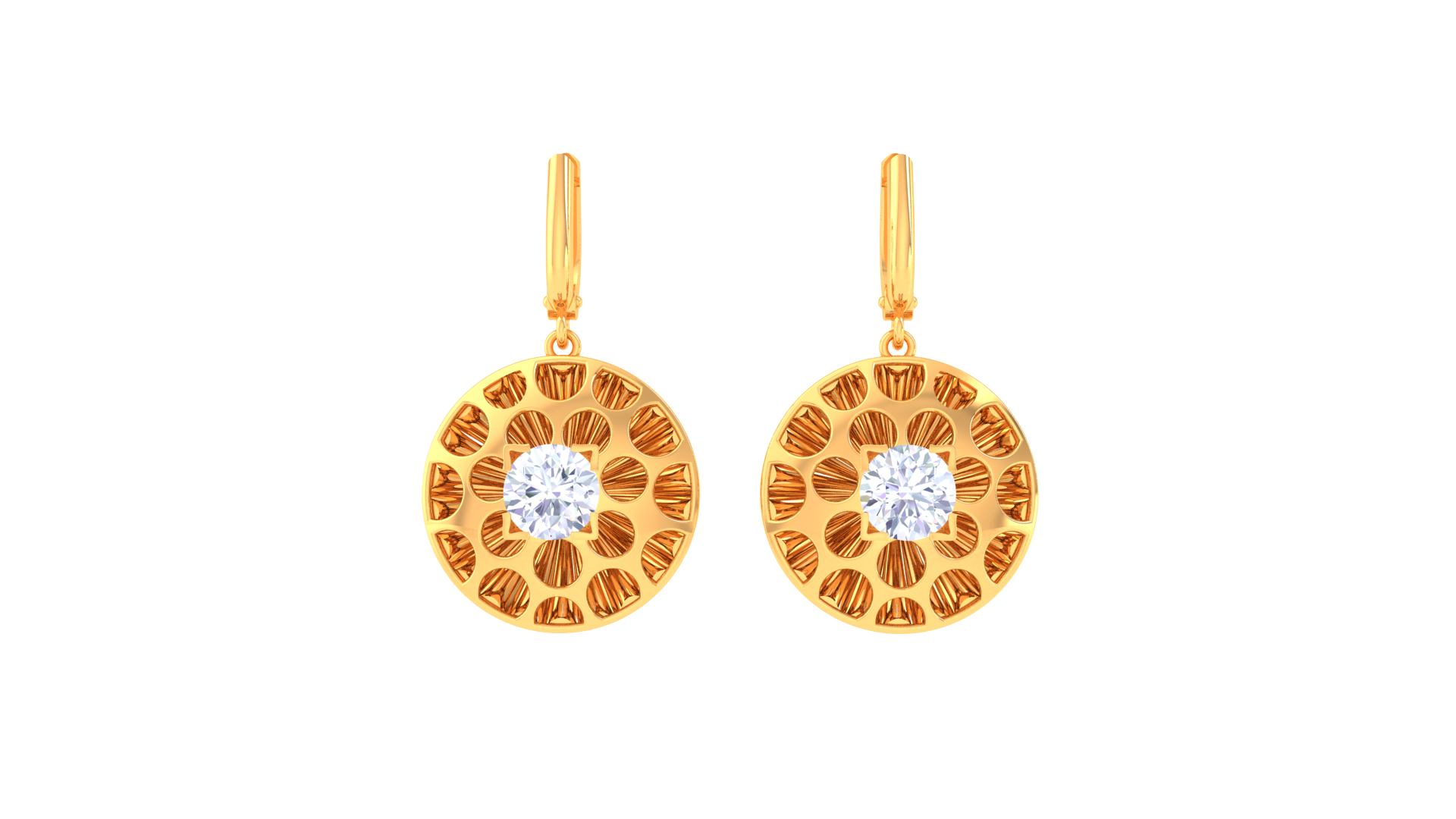 Radiating timeless elegance, these intricately crafted gold earrings feature a floral-inspired circular design, each centered with a brilliant 0.64 carat diamond.