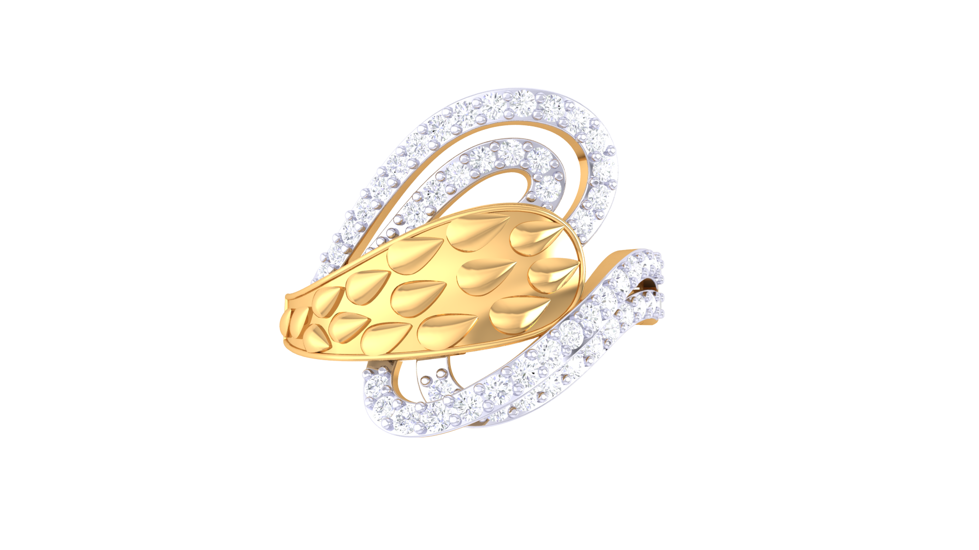 Its teardrop-inspired centerpiece features elongated leaf-like textures framed by graceful diamond-studded curves, creating a harmonious blend of smooth and sparkling surfaces.