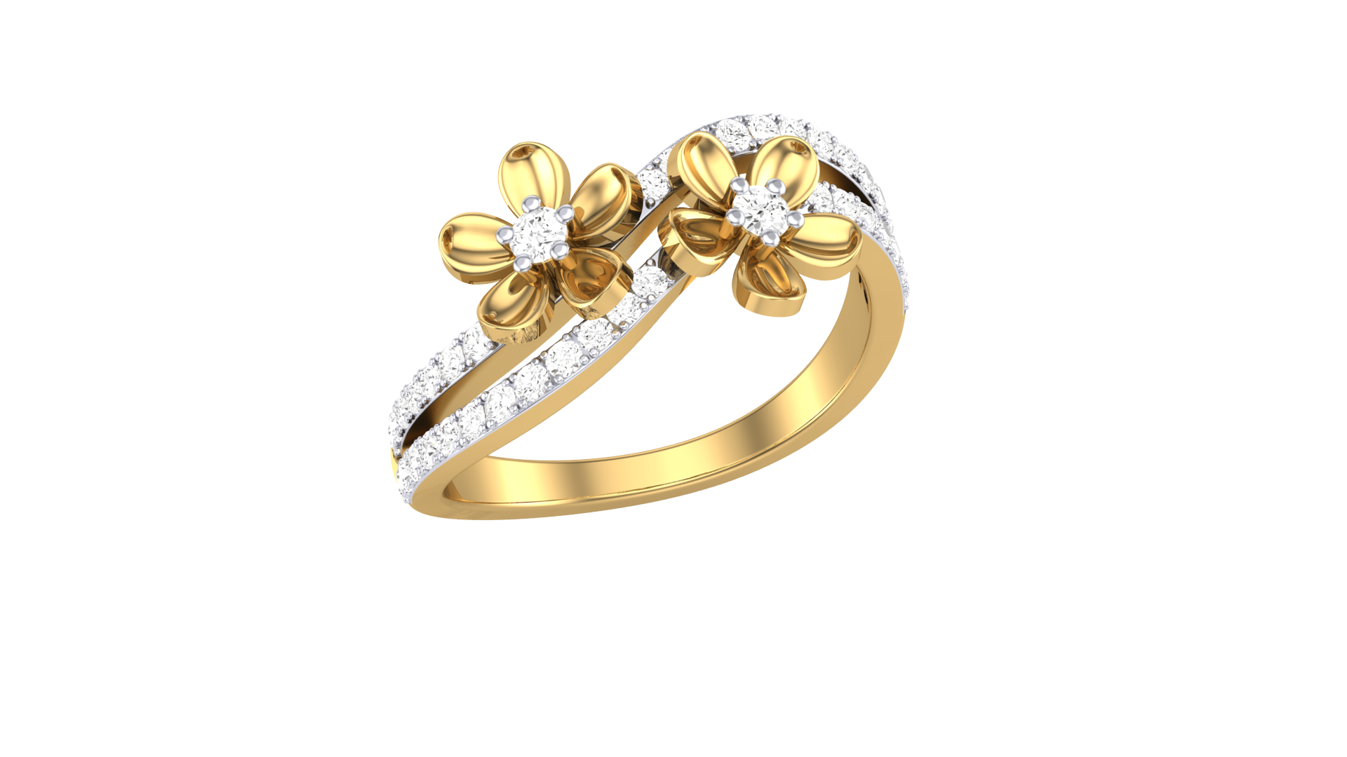 Two five-petaled blossoms bloom gracefully at its center, each crowned with a sparkling diamond and framed by a split band encrusted with 0.33 carats of brilliant-cut diamonds.
